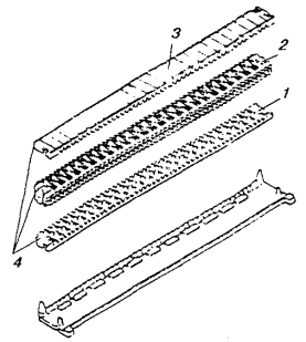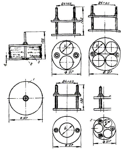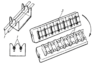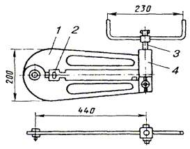 Примечание. В числителе указано количество проводов при прокладке кабеля по открытой местности и отсутствии отдельно стоящих деревьев, опор ВЛ или связи; в знаменателе - при прокладке кабеля по открытой местности или вдоль опушки леса при наличии опор ВЛ или связи. 18.19. Допускается отклонение от принятых в проекте расстояний между защитным проводом и кабелем и между защитными проводами в пределах 15 %. В случае прокладки одного защитного провода над кабелем допускается отклонение расстояния в пределах ±0,25 м от вертикальной плоскости, проходящей через ось кабеля. 18.20. Соединение защитных проводов с металлическими покровами защищаемого кабеля не производят. 18.21. Строительные длины защитных проводов (стальных канатов) сращивают с помощью овальных соединителей и клещей (рис. 18.2 и 18.3), концы медных и биметаллических проводов - с помощью опрессования медными трубками. 18.22. При проведении монтажа муфт в котлованах нарушение целостности защитных проводов не допускается. Рис. 18.2. сращивание защитных проводов ПС-70 с помощью овальных соединителей: а) овальный соединитель; б) сросток после обжатия Рис. 18.3. Клещи типа МИ-31 для обжатия овальных соединителей: 1 - корпус; 2 - вкладыш; 3 - нажимной винт; 4 - регулировочный винт УСТАНОВКА И МОНТАЖ РЕДУКЦИОННЫХ ТРАНСФОРМАТОРОВ18.23. Редукционные трансформаторы (РТ) предназначены для защиты цепей кабелей от перенапряжений при опасном влиянии эл. ж. д. переменного тока и ВЛ. Изготавливают РТ для одно- и четырехчетверочных кабелей симметричной конструкции и однокоаксиальных кабелей ВКПА. 18.24. Типы РТ и марки защищаемых кабелей приведены в табл. 18.7, а габариты и масса РТ - в табл. 18.8. Таблица 18.7 Типы РТ и марки защищаемых ими кабелей