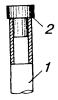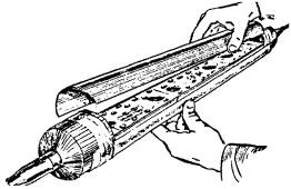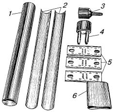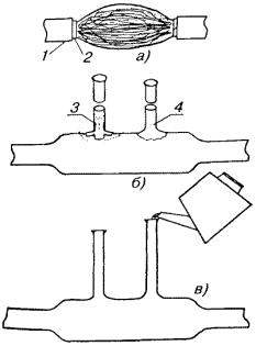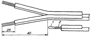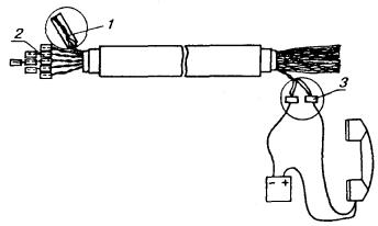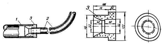 Рис. 11.33. Полиэтиленовая соединительная муфта типа МПС, используемая в качестве газонепроницаемой Корпуса ГНМ изготавливаются в заводских условиях. Патрубки для заливки массы напаиваются на ГНМ типа МСГ в процессе монтажа. Полиэтиленовые ГНМ должны оснащаться металлическими вентилями с внутренним диаметром отверстий не менее 5 мм. ГНМ на кабелях типа Т заливаются заливочной кабельной массой МКС-6, на кабелях типа ТП - эпоксидно-тиоколовым заливочным компаундом ЭТЗК. 11.119. Если монтаж ГНМ производится в помещении ввода кабелей АТС, в шкафном колодце или на кабеле, включенном в бокс, то ее корпус надевают на конец кабеля и продвигают к месту монтажа. Если ГНМ предстоит установить на уже смонтированном кабеле, например, на границе зон обслуживания телефонных узлов, то корпус ГНМ разрезается вдоль, устанавливается на кабель и запаивается (на МСГ) или заваривается (на полиэтиленовых ГНМ). 11.120. Перед установкой муфт на кабель места будущей пайки (или сварки) тщательно зачищаются. По размерам муфты на кабеле отмечают участок оболочки, подлежащий удалению. Обрезы оболочки после распушивания сердечника должны входить в конусы муфты на 30 - 40 мм. Оболочка в намеченных местах надрезается и удаляется, внутренние элементы кабеля (поясная изоляция, экранные ленты) обрезаются на определенном для данного типа кабеля расстоянии от обреза оболочки. Кабель с обеих сторон подтягивается к центру освобождаемого от оболочки участка сердечника и при этом слегка разворачивается в направлении, обеспечивающем образование слабины и распушение сердечника. В этом положении кабель фиксируется на консолях перевязкой. Нитки и ленты, разделяющие пучки и повивы кабеля, осторожно обрезают и удаляют. Каждый пучок и повив сердечника, в свою очередь, должен распушиваться. Особое внимание при этом следует уделять разбору центральных пучков и повивов кабеля. 11.121. Особенности монтажа ГНМ на кабелях типа Т состоят в том, что у обрезов оболочки сердечник кабеля перевязывается миткалевой лентой, которая затем осторожно заталкивается под оболочку. Бумажные ленты поясной изоляции обрезаются на расстоянии 5 мм от обреза свинцовой оболочки. Распушенный сердечник просушивается горячим воздухом над пламенем газовой горелки, после сушки он без натяжения обматывается одним слоем марлевого бинта. На сердечник кабеля надвигается корпус муфты. Предварительно на корпусе, в местах установки патрубков, прорезаются или высверливаются отверстия диаметром не менее 20 мм. Конусы муфты зачеканиваются до диаметра оболочки, муфта устанавливается на место отверстиями вверх и припаивается к оболочке. Патрубки для заливки массы изготавливаются с внутренним диаметром не менее 20 мм, длиной 200 - 300 мм. Один из патрубков делается более длинным. Патрубки зачищаются с одной стороны на участке длиной 50 - 70 мм и разрезаются на несколько лепестков (рис. 11.34, б). Противоположные концы патрубков развальцовываются. Подготовленные патрубки устанавливаются над отверстиями и припаиваются к муфте. Рис. 11.34. Монтаж ГНМ на кабеле типа Т: а) разделка кабеля: 1 - обрез свинцовой оболочки; 2 - бумажная поясная изоляция; б) установка и запайка свинцовой муфты: 3 - патрубок, подготовленный и установленный на отверстие в муфте; 4 - напаянный патрубок; в) заливка ГНМ массой МКС-6 Масса МКС-6 разогревается в стальном с