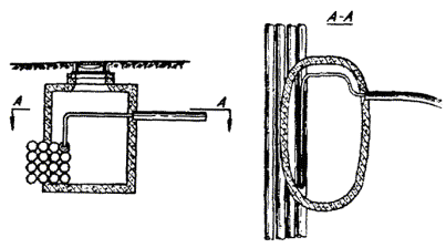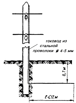 18.53. В качестве протяженного заземлителя используют стальную оцинкованную проволоку диаметром 4 - 5 мм и длиной до 12 м (рис. 18.8). Увеличение длины заземлителя свыше 12 м нецелесообразно, так как в этом случае сопротивление растеканию заземлителя уменьшается незначительно. Величины сопротивления растеканию протяженного заземлителя из проволоки диаметром 4 мм, уложенной на глубину 0,7 м, приведены в табл. 18.12. Рис. 18.8. Протяженный заземлитель Таблица 18.12 Сопротивления растеканию одиночного заземлителя из стальной проволоки диаметром 4 мм