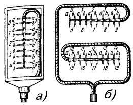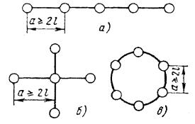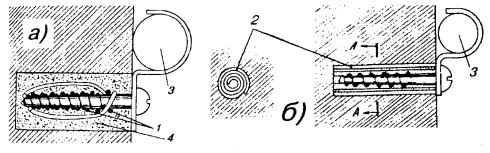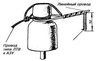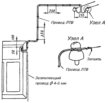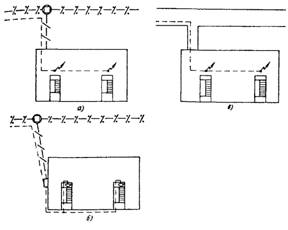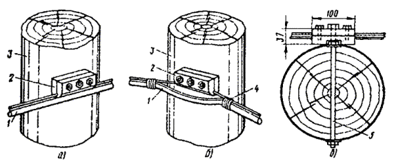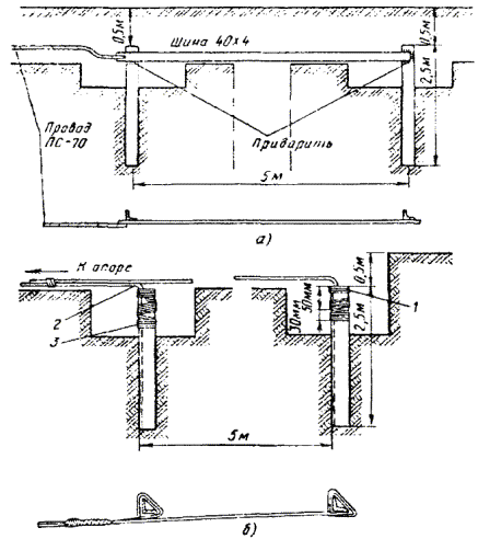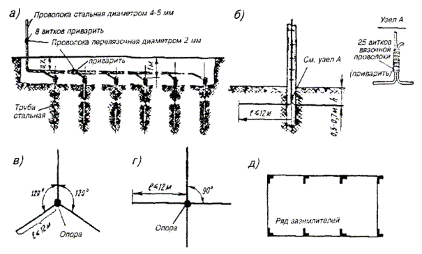 18.54. Если при установке одиночного заземлителя не удается получить требуемую величину сопротивления заземления, то следует оборудовать многоэлектродные заземления. Контуры заземляющих устройств многоэлектродных заземлений могут быть однорядными, замкнутыми, многорядными, в виде прямой или креста. Примеры многоэлектродных контуров показаны на рис. 18.9. Многоэлектродные протяженные (проволочные) заземлители, а также соединение трубчатых заземлителей проводами показано на рис. 18.10. Провода, если их больше двух, свивают с шагом 10 - 25 см. Рис. 18.9. Расположение электродов заземления: а) в один ряд; б) в форме креста; в) в форме круга l - длина одиночного электрода Рис. 18.10. Многоэлектродные заземлители: а) из нескольких электродов угловой стали (или стальных труб); б) двухлучевой протяженный; в) трехлучевой протяженный; г) четырехлучевой протяженный; д) единичные электроды, расположенные по замкнутому контуру 18.55. Для соединения вертикальных электродов между ними следует прокопать траншею шириной 20 - 30 см и глубиной 0,5 - 0,7 м, на дно которой укладывают соединительные провода или шины. В качестве соединительных используют стальные шины (полосовая сталь) сечением 40´4, 30´4, 25´4 мм. Шины нужно уложить на ребро и приварить к уголкам или трубчатым электродам. Вместо стальных шин можно применять стальные провода ПС-70 или биметаллические сталемедные провода диаметром 4 - 6 мм. Соединение электродов из уголков с помощью стальной шины показано на рис. 18.11. Рис. 18.11. Заземления для защиты кабелей от ударов молнии: а) соединение с заземлением провода ПС-70 или шины для защитных контуров; б) соединение с заземлением проводов для искровых промежутков 1 - хомутик из перевязочной проволоки; 2 - стальная проволока диаметром 4 - 5 мм; 3 - витки пропаять 18.56. При устройстве рабочих заземлений во всех грунтах, а защитных - в агрессивных, соединительные провода на всем протяжении до выхода на поверхность следует изолировать от земли двухслойным покрытием асфальтового лака. После выполнения указанных работ траншею нужно засыпать землей. 18.57. В процессе выполнения строительных работ число электродов в контуре может быть уточнено по результатам измерений сопротивления растеканию при последовательном наращивании устанавливаемых электродов. При этом число электродов, необходимое для обеспечения нормы сопротивления заземления, может отличаться от запроектированного как в сторону увеличения, так и в сторону уменьшения. 18.58. Заземлители многоэлектродного контура следует располагать так, чтобы токоотводный провод занимал центральное место и был удален от крайних электродов заземления не более, чем на 12 м. Если это условие невыполнимо, то необходимо делать несколько токоотводов, соединяя их параллельно на выходе из траншеи первого токоотвода. Если заземление предназначено для кабельного ящика, запирающей или дренажной катушки, то от заземлителей вдоль опоры прокладывают два токоотвода из проволоки диаметром 4 - 5 мм, один из которых присоединяют к корпусу кабельного ящика или к заземляющему зажиму запирающей катушки, а другой прокладывают до вершины опоры. 18.59. Выбор типа заземлителя для устройства заземления у абонента производят в зависимости от местных условий. В городе для заземления используют стальные вертикальные электроды - трубы или уголки. Протяженные про