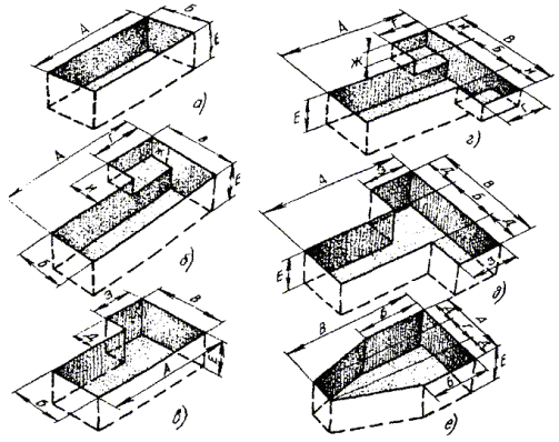 Примечание. В числителе указаны размеры в пешеходной части улиц, а в знаменателе - в проезжей. 3.105. Перекрытия для типовых кирпичных колодцев изготовляют в виде отдельных или сборных железобетонных плит. Для проходных кирпичных колодцев типа ККС-5 - ККС-2 и угловых типа ККСу-5 - ККСу-3 перекрытия изготовляют в виде одной железобетонной плиты с отверстием под люк. Для разветвительных кирпичных колодцев типа ККСр-5 - ККСр-3 перекрытия могут изготовляться сборными из двух железобетонных плит: одной (большей) с отверстием под люк и второй (меньшей) - без отверстия. Для станционных кирпичных колодцев могут применяться готовые сборные железобетонные перекрытия. Допускается также применение сборных железобетонных перекрытий, состоящих из двух плит, изготовляемых на стройплощадке или заводе железобетонных изделий. При этом для колодца АТС на 3000 номеров одна плита (большая) изготовляется с отверстием под люк, а вторая (меньшая) - без отверстия. Для станционных кирпичных колодцев АТС на 6 - 20 тысяч номеров обе плиты (одинаковых размеров) изготовляются с отверстиями под люк. При малом числе кирпичных станционных и разветви - тельных колодцев на объекте строительства допускается также бетонирование перекрытий на месте (в котловане) с применением арматурных каркасов и деревянных опалубок. КОТЛОВАНЫ ДЛЯ КАБЕЛЬНЫХ КОЛОДЦЕВ СВЯЗИ3.106. Формы и размеры котлованов для колодцев различных типов, отрываемых без крепления и с креплением стен, рассчитаны на минимально возможный объем земляных работ. При этом учитывается размещение основных деталей, колодцев на слежавшийся выровненный, хорошо подтрамбованный грунт. Основными типами являются котлованы для проходных, угловых, разветвительных, станционных и специальных колодцев различных типов (рис. 3.35). Размеры котлованов приведены в табл. 3.15. Рис. 3.35. Котлован для строительства кабельных колодцев: а) проходных ККС и ККСС; б), в) угловых ККСу и ККССу; г) разветвительных ККСр и ККССр; д) кирпичных и монолитных железобетонных разветвительных; е) станционных Таблица 3.15 Размеры котлованов для колодцев кабельной связи, м