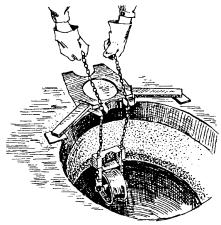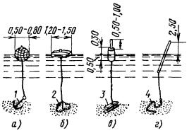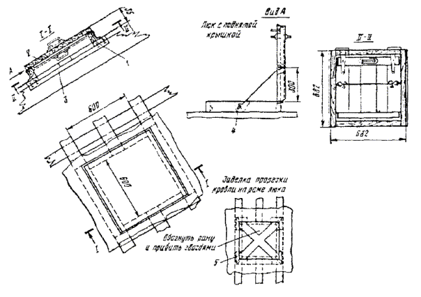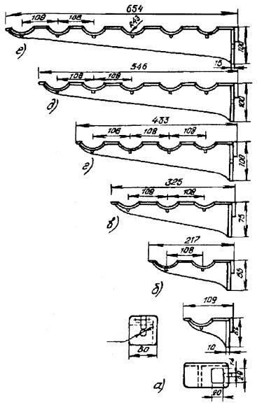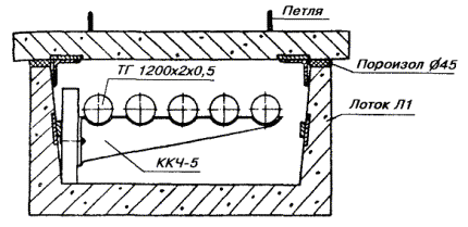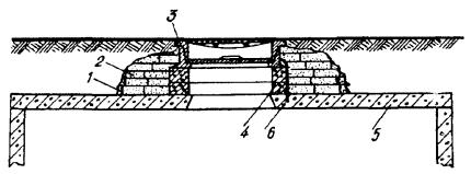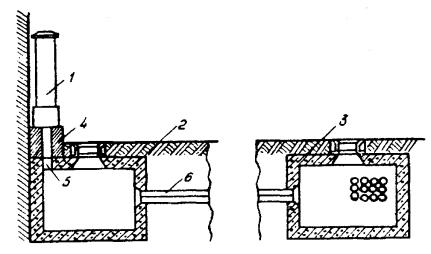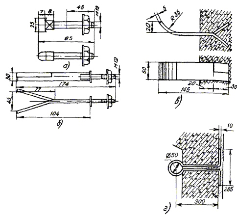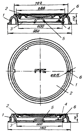 Примечания: 1. В числителе указаны размеры котлованов без крепления стен, в знаменателе - с креплением. 2. Епеш - пешеходная часть, Епр - проезжая часть. ОБОРУДОВАНИЕ КОЛОДЦЕВ КАБЕЛЬНОЙ СВЯЗИ3.107. Колодцы кабельной связи оборудуют входными круглыми чугунными люками с двумя крышками: верхней чугунной и нижней (внутренней) стальной. На внутренней крышке устроено запорное приспособление для закрытия колодца на замок и ручка для ее подъема (вынимания). Для колодцев, устраиваемых в пешеходной части улиц, должны использоваться люки легкого типа, рассчитанные на нагрузку 30 т, а в проезжей части - люки тяжелого типа на нагрузку 80 т. Каждый люк имеет отверстие для проверки загазованности колодца, не открывая крышек; оно не должно ничем загрязняться. Масса люка легкого типа 82 кг, а тяжелого - 138 кг (рис. 3.36). 3.108. При установке люка на перекрытии колодца сначала должны быть подложены железобетонные опорные кольца на ровной поверхности с круглым отверстием для входа в колодец. Их укладывают по слою раствора бетона толщиной 10 - 12 мм. Основание люка и место стыка его с опорными кольцами следует обмазать бетонным раствором со щебенкой толщиной 30 - 50 мм. В проезжих частях улиц для большей устойчивости люки тяжелого типа должны закрепляться (привязываться) к арматуре перекрытий стальной проволокой диаметром 6 мм с усиленным бетонированием. Верхняя плоскость крышки люка во всех случаях должна строго совпадать с уровнем уличного покрытия или поверхностью грунта. 3.109. Для раскладки кабелей все колодцы, кроме ККС-1 и ККС-2, должны оборудоваться стальными кронштейнами (рис. 3.37). Кронштейны изготовляются типа ККП из полосовой и типа ККУ - из угловой стали. На кронштейнах необходимо устанавливать чугунные консоли одно - шестиместные (рис. 3.38) в зависимости от намечаемой нагрузки, закрепляемые консольными болтами (рис. 3.39, а). Допускается применение маломестных консолей алюминиевого сплава. Рис. 3.36. Чугунные люки тяжелого и легкого типов для кабельных колодцев: 1 - корпус (рама); 2 - верхняя чугунная крышка; 3 - нижняя стальная крышка; 4 - запорное приспособление; 5 - ручка; 6 - отверстие для проверки загазованности колодца Рис. 3.37. Кронштейны стальные кабельные: а) КПК-600; б) КПК-1300; в) ККУ-1300; г) ККУ-1900 1 - основание; 2 - стальной сухарь Рис. 3.38. Консоли чугунные для кабельных колодцев, шахт, коллекторов: а) ККЧ-1; б) ККЧ-2; в) ККЧ-3; г) ККЧ-4; д) ККЧ-5; е) ККЧ-6 Рис. 3.39. Крепежные детали для кабельных колодцев: а) консольный болт; б) анкерный болт (стальной ерш); в) консольный крюк; г) стальная серьга (петля) 3.110. В колодцах типа ККС-3 и ККС-4 следует устанавливать по два кронштейна на каждой продольной стенке, а в колодцах типа ККС-5 - по три кронштейна. В угловых и разветвительных колодцах, при необходимости, могут быть установлены дополнительные кронштейны на торцевых стенах и в простенках между ними. В станционных колодцах малых АТС кронштейны устанавливают на трех стенках, а в колодцах для АТС на 6 - 20 тысяч номеров, кроме того, и в средней части колодца с креплением их в днище и в перекрытии. К стенам колодца кронштейны должны крепиться анкерными болтами (стальными ершами), вмазываемыми в предусмотренные для этого выемки (рис. 3.39, б). В колодцах типа ККС-1 и ККС-2 вместо кронштейнов следует вмазывать в стенки консольные крюки (рис. 3.39, в), по одному в колодцах типа ККС-1 и по два - в колодцах типа ККС-2. 3.111. 