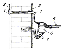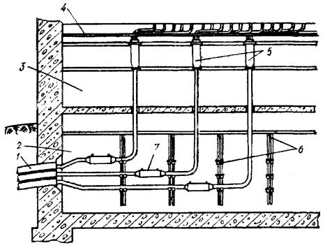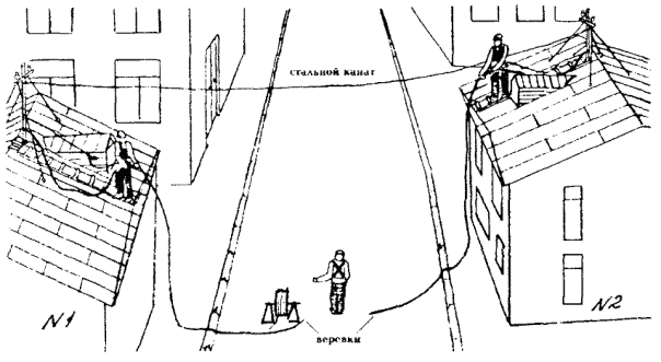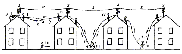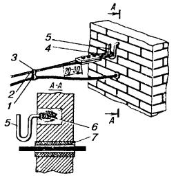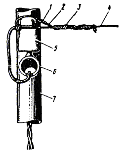 9.24. При работе на крышах зданий необходимо строго соблюдать требования правил техники безопасности, в том числе требование о необходимости перед выходом на металлическую кровлю с помощью индикатора напряжения убедиться в отсутствии в ней опасного напряжения. При выходе на крышу следует закрепить карабин монтерского пояса за канат, протянутый между слуховым окном и стойкой. Дойдя до стойки, закрепиться за нее цепью монтерского пояса. УСТАНОВКА КАБЕЛЬНОГО ЯЩИКА И ВКЛЮЧЕНИЕ ПРОВОДОВ9.25. Кабельная стойка должна быть оборудована кабельным ящиком для соединения воздушных проводов с жилами кабеля. Кабельный ящик нужно устанавливать на чердаке, на отдельной монтажной доске, прикрепляемой шурупами по дереву с шестигранной головкой к стропильным балкам. 9.26. Контактные винты на плинтах кабельного ящика следует соединять с отходящими со стойки к абонентским пунктам проводами проводом марки ЛТВ-В или ЛТР-В. 9.27. Провода ЛТВ должны быть пропущены внутри стоечной опоры по вертикальной трубе, а затем по трубчатой траверсе через отверстия в последней (находящееся под штырями) выведены к соответствующей паре изоляторов. При выходе из отверстия в трубчатой траверсе провод ЛТВ должен быть пропущен через изолирующую втулку, заделан на изоляторах траверсы (рис. 9.22) и припаян к опущенным вниз концам (отросткам) стального провода. Провод ЛТВ для заделки следует сложить в виде двух петель, надеть на изолятор и затянуть на шейке так, чтобы между выводной втулкой и изолятором остался запас провода, располагаемый в виде полукольца. Конец провода ЛТВ, включаемого в плинты кабельного ящика, заделывают так же, как и на кабельных опорах столбовых линий. Рис. 9.22. Соединение провода ЛТВ-В (ЛТР-В) с линейным проводом на стойке: 1 - провод ЛТВ-В (ЛТР-В); 2 - резиновая изоляция; 3 - медная жила; 4 - линейный провод; 5 - изолятор; 6 - траверса; 7 - труба стойки 9.28. Чердачные кабельные ящики должны иметь заземление для разрядников, которое оборудуют так же, как и заземления для кабельных ящиков на столбах. Заземляющий проводник от кабельного ящика должен иметь сечение не менее 4 кв. мм, проложен в пределах чердака изолированным и закреплен скобами отдельно от кабеля. ПОДВЕСКА КАБЕЛЕЙ НА СТОЕЧНЫХ ЛИНИЯХ9.29. На стоечных линиях подвешивают кабели марки ТГ, ТПП и ТППт емкостью до 30´2´0,5. 9.30. Кабели следует подвешивать на семижильном стальном канате, диаметр которого выбирают по таблице 8.18. В негололедных районах допускается подвеска кабелей на стальной оцинкованной проволоке диаметром 5 мм. 9.31. Кабель к канату следует крепить подвесами через каждые 350 мм. 9.32. Подвешиваемые канат или проволока не должны иметь сростков в пролете. 9.33. Стальной канат или проволоку следует подвешивать попролетно по всей длине трассы способом, приведенным в п. 9.20. 9.34. После регулировки стрелы провеса стальной канат или проволоку необходимо закреплять за стойку оконечной заделкой. Для возможности регулировки натяжения в пролетах стального каната оконечную заделку рекомендуется выполнять через струбцину (винтовую стяжку). 9.35. Барабан с кабелем или бухту кабеля следует размещать на земле возле здания, от которого начинается подвеска, или, что предпочтительнее, на крыше здания (если имеется такая возможность). 9.36. В том случае, когда подвеска кабеля производится с земли, работы необходимо выполнять в у