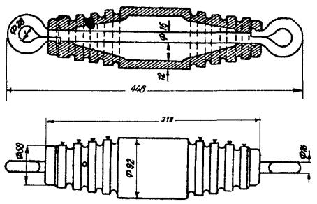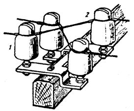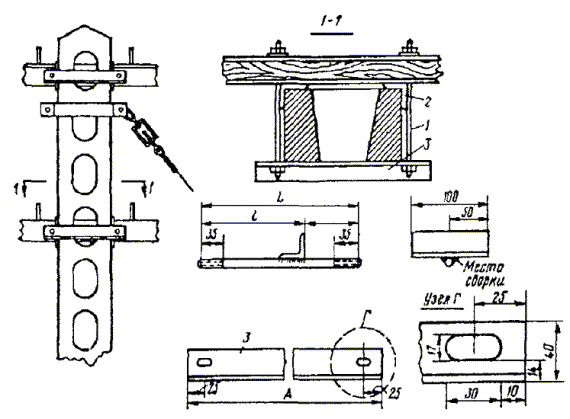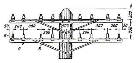 Рис. 8.1б. Типовые профили воздушных линий связи Наиболее распространенными профилями сельских ВЛС и ГТС являются профили №№ 1а, 2а, 3а с расстояниями между крюками - 300 мм. Типовые профили опор для линий совместной подвески телефонных цепей сельской связи и проводного вещания показаны на рис. 8.2. Рис. 8.2. Типовые профили опор для линий совместной подвески На линиях совместной подвески цепь проводного вещания, как правило, подвешивается на первом (верхнем) месте, а телефонные цепи, с целью предотвращения влияния цепи проводного вещания, располагаются от этой цепи на расстоянии 1,2 м. 8.4. Строительство воздушных столбовых линий связи с подвеской проводов включает в себя выполнение следующих работ: а) изготовление и оснастку опор, б) разбивку трассы линии, в) транспортировку опор и материалов на трассу, г) бурение (рытье) ям под опоры, д) установку и укрепление опор, е) раскатку проволоки и соединение проводов, ж) подвеску и регулирование проводов, з) вязку проводов на изоляторах, и) монтаж проводов при скрещивании, к) оборудование кабельных опор. 8.5. При подвеске кабеля на опорах ВЛС выполняют следующие работы: а) установка на опорах арматуры для крепления несущего или встроенного в кабель стального каната; б) раскатка несущего стального каната по трассе, его подвеска с регулировкой стрелы провеса; в) раскатка кабеля, крепление его к стальному канату. При подвеске кабеля с встроенным тросом производится раскатка кабеля по трассе, подъем его на опоры, регулировка стрел провеса и крепление встроенного троса в специальных зажимах, установленных на опорах. ЛИНЕЙНАЯ АРМАТУРА, МАТЕРИАЛЫ И ИНСТРУМЕНТ8.6. На столбовых линиях местных сетей применяется линейная проволока: стальная оцинкованная диаметром 2; 2,5; 3; 4 мм, биметаллическая (сталемедная) марок БСМ-1 и БСМ-2, сталеалюминиевая проволока марки БСА-КПЛ диаметром 2,7; 4,3 мм, провода с атмосферостойкой изоляцией ПСБАР, ПСБАП, ПРСП. 8.7. Для крепления (вязки) на изоляторах стальных проводов диаметром 1,5 - 2 мм, 3 мм, 4 мм применяют стальную оцинкованную проволоку диаметром соответственно 1,2; 2,0; 2,5 мм. Для крепления биметаллической сталемедной проволоки диаметром 4; 3; 2; 1,6 мм применяют медную или биметаллическую проволоку диаметром соответственно 2,5; 2,0; 1,2 мм. 8.8. Для оснастки опор и траверс применяется следующая арматура: а) крюки стальные типа КН для крепления изоляторов на опорах типоразмеров: КН-20, КН-18, КН-16, КН-12; б) штыри стальные типа ШТ для крепления изоляторов на траверсах. Они имеют типоразмеры: ШТ-20Д, ШТ-16Д, ШТ-12Д и ШТ-20УД - для оснастки деревянных траверс и ШТ-20С, ШТ-16С и ШТ-12С - для оснастки стальных траверс; в) Г-образные кронштейны для скрещивания телефонных цепей, подвешиваемых на крюках; г) подвесные крюки и накладки для скрещивания цепей, подвешиваемых на траверсах; д) изоляторы фарфоровые типа ТФ, имеющие типоразмеры в зависимости от диаметров крюков и штырей ТФ-12, ТФ-16, ТФ-20. 8.9. Траверсы изготавливаются из древесины (сосна, ель, лиственница) и стали. Как деревянные, так и стальные траверсы могут быть четырехштырные и восьмиштырные. 8.10. В качестве линейных крепежных материалов применяют болты с гайками, шайбы, шурупы с шестигранной головкой («глухарь»), барочные гвозди, скобы строительные, подкосы, коуши, зажимы двухболтовые и трехболтовые, трубки медные для соединения биметаллических (сталемедных) прово