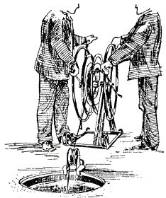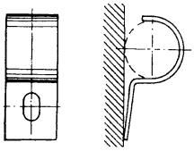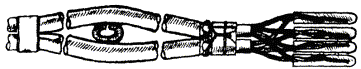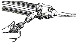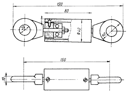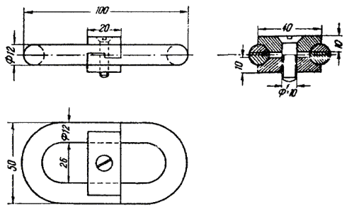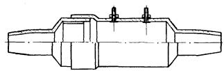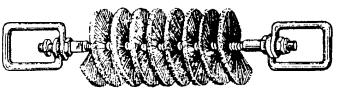 Пробный цилиндр, щетка и канат, конец которого должен быть заделан петлей и оснащен коушем, скрепляют между собой карабинами. К щетке прикрепляют конец заготовочной проволоки, которую протягивают по каналу через весь пролет. 4.32. Протянутый по каналу канат освобождается от пробного цилиндра и щетки, скрепляется с концом кабеля посредством специального стального кабельного чулка (рис. 4.6), через карабин. Рис. 4.6. Чулки стальные кабельные: а - концевой; б - сквозной; в - разрезной Размеры чулков приведены в табл. 4.2. При прокладке кабелей емкостью свыше 600 пар между чулком и кабелем необходимо устанавливать компенсатор кручения (рис. 4.7) для предотвращения осевого скручивания кабеля при тяжении. Рис. 4.7. Компенсатор кручения Таблица 4.2