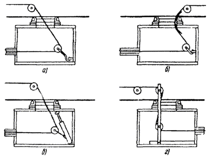 4.31. На кабелях со свинцовой оболочкой, для обеспечения более плотного обжатия сердечника чулком, оболочку рекомендуется усадить обивкой деревянным молотком, на кабелях с полиэтиленовой оболочкой по концу на всей длине чулка наложить 3 - 4 слоя пластмассовой или прорезиненной ленты. Концевой чулок надевается на кабель и закрепляется в 2 - 3 местах наложением бандажей из мягкой стальной проволоки диаметром 1,5 - 2,0 мм. При прокладке кабеля по занятому каналу стальной чулок по всей длине должен быть обмотан 2 - 3 слоями пластмассовой или прорезиненной ленты. При прокладке кабелей большой емкости или большой массы (если возникает вероятность больших тяговых усилий) сердечник вместе с чулком необходимо прошить стальной проволокой в нескольких местах и закрепить бандажом. 4.32. Прокладку кабеля следует производить при температуре окружающего воздуха не ниже: минус 20 °С - для кабелей в свинцовой оболочке; минус 10 °С - для кабелей в полиэтиленовой оболочке. Прокладку кабелей при более низких температурах производят после предварительного прогрева его на барабане или выдержки в закрытом отапливаемом помещении в течение 48 часов при температуре 20 - 22 °С. Для прогрева кабеля, непосредственно перед прокладкой применяют портативные подогреватели и специальный брезентовый чехол, надеваемый на барабан. 4.33. Подготовленный к прокладке конец кабеля вводится в канал с одновременной подмоткой тягового каната лебедкой или вручную с противоположной стороны в колодце. Для предотвращения повреждения его оболочки на вход канала первого колодца (и во всех транзитных колодцах) необходимо устанавливать разрезные полиэтиленовые втулки или кабельные колена (рис. 4.8). Рис. 4.8. Приспособления для защиты затягиваемого кабеля на вводе в канал а - кабельное колено; б - разрезная предохранительная втулка; в - защита кабеля кабельным коленом; г - защита кабеля разрезной втулкой Кабель должен входить в канал по плавной круговой траектории и не касаться люка колодца. Скорость тяжения кабеля должна быть равномерной и находиться в пределах 9 - 30 м/мин в зависимости от массы прокладываемого кабеля, длины пролета, сложности трассы. 4.34. Руководство прокладкой осуществляет монтажник, имеющий наивысшую в данной бригаде (звене) квалификацию и находящийся во время прокладки возле барабана с кабелем. Для оперативного управления прокладкой рекомендуется организовывать радиосвязь по всей трассе рациями УКВ. 4.35. Кабельную машину или ручную лебедку устанавливают в непосредственной близости от люка колодца. При необходимости, на выходе из канала и на верхней кромке люка колодца применяют кабельные колена или блочное колено, состоящее из набора роликов. 4.36. При прокладке кабелей в свинцовой оболочке для уменьшения трения целесообразно применять смазку оболочки техническим вазелином, но при условии, что в этом канале нет и не предвидится прокладка кабелей с полиэтиленовой оболочкой. Если прокладка ведется через несколько пролетов, то и в транзитных колодцах следует организовать дополнительную смазку свинцовой оболочки кабеля. При прокладке кабелей в полиэтиленовой оболочке технический вазелин для смазки применять нельзя, разрешается использовать для этого нейтральные и не активные к полиэтилену смазки (например, гидрофобное заполнение кабеля, ЛЗК-1). 4.37. Часто проклад
