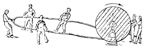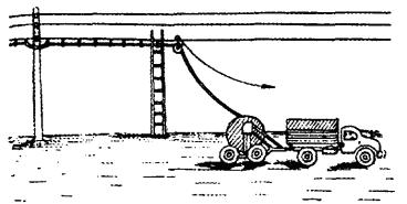 РАСКАТКА ПРОВОЛОКИ И СОЕДИНЕНИЕ ПРОВОДОВ8.63. Проволоку рекомендуется раскатывать по земле с двойного тамбура, установленного на автомобиль. При этом одновременно раскатываются два провода, предварительно закрепленные за опору, от которой начинается раскатка (рис. 8.28). Рис. 8.28. Раскатка проволоки с двухтамбурной установки При раскатке проволоки следует следить, чтобы автомобиль передвигался равномерно. Необходимо исключить закручивания, спутывание проволоки и появление на ней барашков. При необходимости рабочий, находящийся у тамбура, должен притормаживать его имеющимся тормозом. Если при размотке проволоки образуется «барашек» (затянувшаяся петля), он должен быть вырезан. Вырезаются также и места проволоки, на которых имеются дефекты: надломы, трещины, расплющенности и т.п. Если невозможно вести раскатку проволоки с автомобиля, ее следует производить с переносного облегченного тамбура (рис. 8.29). Рис. 8.29. Раскатка проволоки вручную с переносного облегченного тамбура 8.64. Стальная проволока после раскатки должна быть вытянута. При этом один конец проволоки зажимают в блочную лапку, которую при помощи петли или хомута закрепляют у основания начальной опоры вытягиваемого участка (6 - 8 пролетов) (рис. 8.30 а). На другом конце вытягиваемого участка проволоку зажимают в блочную лапку, присоединенную к опоре через динамометр и блоки (рис. 8.30 б). Величины усилий при вытягивании проволоки необходимо контролировать динамометром, они должны соответствовать величинам, приведенным в табл. 8.12. Вытягивать медную или биметаллическую проволоку не допускается, неровные места и изгибы должны быть выровнены деревянным молотком на деревянной доске. Таблица 8.12