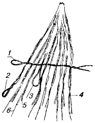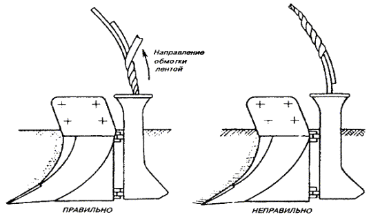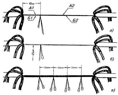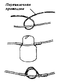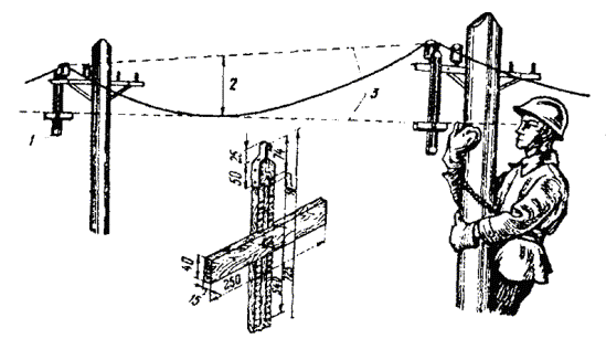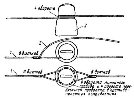 а) на опорах с двух сторон регулируемого участка у изоляторов на провод подвешиваются две рейки; б) визиры обеих реек ставятся на величину, соответствующую стреле провеса для данного пролета (по таблицам 8.13, 8.14), с учетом температуры окружающего воздуха. При этом визиры обеих реек на проводе должны быть направлены в разные стороны; в) рабочий, находящийся на одной из опор, смотрит через отверстие в визире (или поверх поперечины) одной рейки на отверстие (поперечину) другой рейки; провод натягивают или ослабляют блоками до тех пор, пока нижняя точка провеса провода не окажется на линии, проходящей через отверстия в визирах рейки (рис. 8.39); г) после получения необходимой стрелы провеса провод закрепляют на изоляторах перевязочной проволокой на протяжении всего регулируемого участка. 8.76. При регулировании нескольких цепей достаточно отрегулировать только один верхний провод, а все остальные провода регулируют, наблюдая за их параллельностью. Рис. 8.39. Определение стрелы провеса провода: 1 - рейка для измерения стрелы провеса; 2 - стрела провеса провода; 3 - воображаемые прямые линии При подвеске проводов на вновь строящейся линии опоры могут быть выведены из вертикального положения силой тяги проводов. Чтобы этого не случилось, необходимо последнюю опору, на которой закрепляются провода, до снятия блоков укрепить временной оттяжкой. Эта оттяжка заделывается одним концом за вершину укрепляемой опоры и другим - за основание последующей опоры. Снимается оттяжка после натягивания проводов в следующих пролетах. 8.77. При работе с биметаллическими проводами лапки блоков должны быть с параллельными губками и медными вкладышами. ВЯЗКА ПРОВОДОВ НА ИЗОЛЯТОРАХ8.78. Отрегулированные провода закрепляют на изоляторах промежуточной, угловой или оконечной опорах вязками, которые не должны допускать перемещения провода из одного пролета в другой. Вязка производится перевязочной проволокой, длина которой указана в табл. 8.16. 8.79. На прямых участках линии вязку выполняют двумя кусками перевязочной проволоки в следующем порядке (рис. 8.40): Рис. 8.40. Вязка проводов на изоляторах промежуточных опор Рис. 8.41. Крепление провода к изолятору на угловой опоре а) куском перевязочной проволоки охватывают шейку изолятора так, чтобы один из концов проволоки был длиннее другого на величину, равную диаметру головки изолятора; б) оба конца перевязочной проволоки скручивают таким образом, чтобы они вплотную подходили к желобку в головке изолятора; в) вторым куском перевязочной проволоки охватывают шейку изолятора с другой стороны и также скручивают концы проволоки до желобка в головке изолятора; г) длинные концы обоих кусков перевязочной проволоки перекидывают соответственно на другую сторону изолятора через провод, находящийся в желобке, и отгибают вниз; затем их вместе с короткими концами при помощи специальных плоскогубцев (имеющих в губках углубления) плотно навивают на линейный провод. При отсутствии таких плоскогубцев биметаллические или медные провода вяжут плоскогубцами с медными вкладышами без насечек. Таблица 8.16