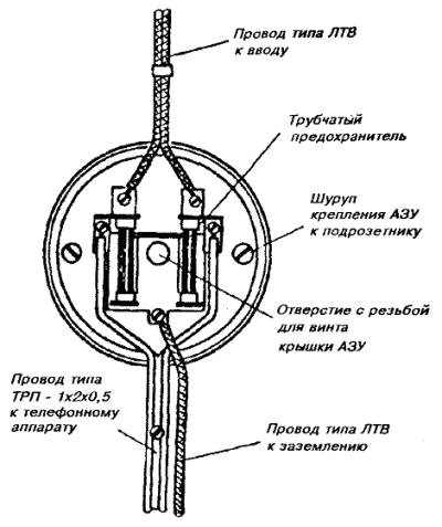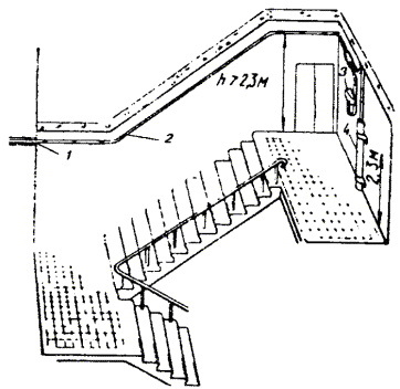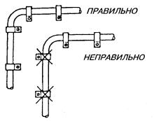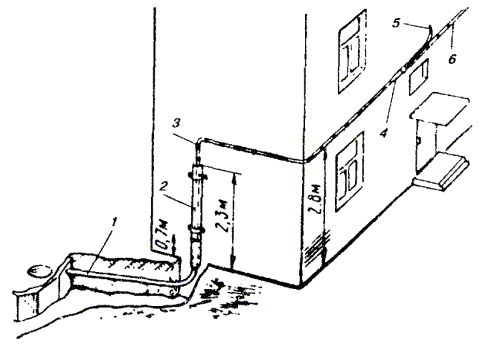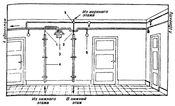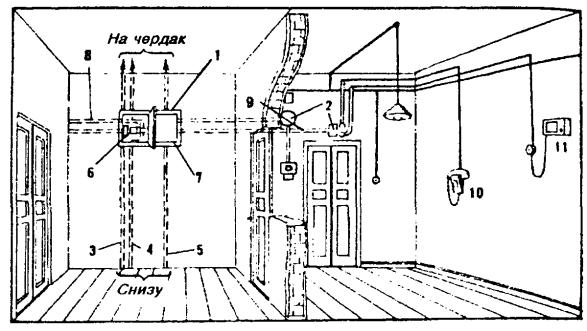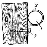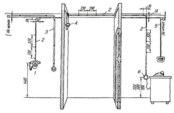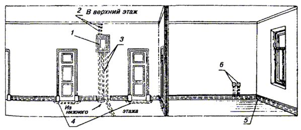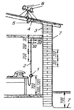 10.18. В помещениях с лепкой или резной отделкой следует прокладывать провод над или под плинтусами, наличниками окон или дверей для защиты от механических повреждений. 10.19. При пересечении карнизов наружных стен, покрытых листовой сталью, провод необходимо прокладывать через отверстие в карнизе. 10.20. При выборе трассы для прокладки абонентских проводов следует, по возможности, не пробивать отверстия через капитальные стены. Сквозь перегородки и дверные коробки провода необходимо прокладывать через отверстия, просверленные в углах перегородок и переплетов. 10.21. Провода ТРП (ТРВ) следует крепить к стенам деревянным, оштукатуренным, кирпичным и шлакоблочным, гипсолитовым и т.п. стальными гвоздями диаметром 1,5 мм длиной 15 или 20 мм, забиваемыми в промежуток между жилами (рис. 10.9, а). При этом необходимо следить, чтобы гвозди не повреждали изоляцию жил. Допускается также крепление проводов скобами из стальной проволоки диаметром 2 мм (рис. 10.9, б). По стенам из бетона, стеклоблоков, камня, кафеля и подобных материалов, в которые забивка гвоздей и проволочных скоб невозможна, а сверление гнезд затруднительно, крепление проводов следует производить специальными скобами, приклеиваемыми к стеновому основанию клеем «Стык-10» или другим, прошедшим испытания. Технология приклеивания скоб приведена в разделе 7. Рис. 10.9. Способы крепления провода ТРП (ТРВ): а) стальными гвоздями; б) скобами из стальной проволоки 10.22. При скрытой проводке провода от КР-10´2 должны прокладываться в закладных устройствах (трубах, каналах) способами, приведенными в разделе 7. УСТАНОВКА ОБОРУДОВАНИЯ АБОНЕНТСКИХ ПУНКТОВ И ПОДСОЕДИНЕНИЕ АБОНЕНТСКИХ ПРОВОДОВ10.23. При необходимости перехода абонентской проводки из одного здания в другое допускается подвеска однопарного провода на стальной оцинкованной проволоке диаметром 3 мм, закрепленной на стенах зданий. Для этого однопарный провод следует навить вокруг натянутой проволоки с шагом 160 - 200 мм. Длина подвески не должна превышать 25 м, а высота - 4,5 - 5,9 м от земли. 10.24. На лестничных клетках и в коридорах общественных зданий однопарные провода, прокладываемые ниже 2,3 м от пола, должны быть защищены металлическими или деревянными желобами. 10.25. Вводные или проходные отверстия в междуэтажных перекрытиях и на лестничных клетках после прокладки однопарного провода следует плотно заделать паклей, гипсом или алебастром. 10.26. При установке оборудования абонентских пунктов необходимо соблюдать следующую высоту установки от пола: настенные телефонные аппараты 1400 мм; розетки настольных аппаратов 250 - 700 мм; диодные приставки и безобрывные розетки 250 - 700 мм; блоки АВУ 700 мм; блокираторы и дополнительные звонки 2200 мм. Виды абонентских проводок показаны на рис. 10.10. Рис. 10.10. Виды абонентских проводок: 1 - настенный телефонный аппарат; 2 - однопарный провод; 3 - электропроводка; 4 - коробка распределительная 10´2; 5 - радиопроводка; 6 - розетка настольного телефонного аппарата 10.27. Розетки телефонных аппаратов, АЗУ, диодные приставки следует крепить к деревянным стенам шурупами, к кирпичным, шлакоблочным, гипсолитовым стенам - шурупами на пластмассовых дюбелях или спиралях; настенные телефонные аппараты - на дюбелях с распорной гайкой или пластмассовых; подрозетники - к бетонным, стеклоблочным стенам и на оборудовании с металлическими поверхностям
