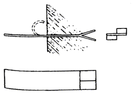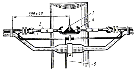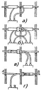 8.80. На угловых опорах провода закрепляются одним отрезком проволоки. При этом отрезок перевязочной проволоки, длина которого определена по табл. 8.16, прикладывают крестообразно к линейному проводу. Концы перевязочной проволоки обвивают вокруг шейки изоляторов, а затем при помощи плоскогубцев плотно обвивают вокруг линейного провода (рис. 8.41). Крепление проводов на оконечных опорах производится так, как показано на рис. 8.42. Рис. 8.42. Крепление стального провода на оконечной опоре 8.81. Провода цветных металлов на оконечной опоре закрепляют с помощью медной трубки так, как показано на рис. 8.43. Рис. 8.43. Оконечная заделка провода из цветного металла Рис. 8.44. Оконечная заделка провода малого диаметра скруткой При отсутствии трубок оконечную заделку делают так, как показано на рис. 8.44. 8.82. Сталеалюминевые провода крепят на изоляторах алюминиевой мягкой проволокой диаметром 3 мм или стальной оцинкованной перевязочной проволокой диаметром 2,5 мм. В месте вязки на провод по направлению повива алюминиевых проводников плотно наматывают алюминиевую ленту. При вязке биметаллических сталемедных проводов биметаллической перевязочной проволокой под последнюю подкладывают медную ленту (фольгу) размером 300´10´0,1 мм. Если применяется медная перевязочная проволока, медную ленту не подкладывают. 8.83. При креплении (вязке) проводов на изоляторах рекомендуется пользоваться клетневкой. МОНТАЖ ПРОВОДОВ ПРИ СКРЕЩИВАНИИ8.84. Скрещивание проводов производится с целью уменьшения влияния между цепями. Схемы скрещивания должны быть в составе проектной документации. 8.85. Монтаж проводов при скрещивании производится при траверсном профиле линии на накладках (точечное скрещивание) (рис. 8.45) или на подвесных крюках (в пролетах), а при крюковом профиле линии - на Г-образных кронштейнах (рис. 8.46). 8.45. Устройство скрещивания проводов на накладках 8.46. Устройство скрещивания на Г-образных кронштейнах ПОДВЕСКА КАБЕЛЕЙ НА ВОЗДУШНЫХ СТОЛБОВЫХ ЛИНИЯХ СВЯЗИ8.86. Подвеска кабелей на воздушных столбовых линиях связи определяется проектным решением. Она применяется на распределительных участках ГТС при телефонизации районов индивидуальной застройки, на абонентских и межстанционных линиях СТС, в горной местности, где подземная прокладка кабеля затруднена, в местах с густой сетью арыков, на переходе кабельных линий через глубокие овраги и реки, имеющие обрывистые склоны и в других обоснованных проектом условиях. 8.87. Подвеска, как правило, производится на опорах существующих воздушных линий связи. Для подвески применяются специальные кабели, содержащие в своей конструкции несущий стальной канат (ТППт), а также ТПП (ТПВ), ТГ и КСПП, подвешиваемые на стальном канате. На опорах ВЛС местных сетей допускается подвеска кабелей емкостью до 100 пар. 8.88. Кабель без встроенного каната подвешивают на стальном оцинкованном канате с помощью подвесов из листовой оцинкованной стали (рис. 8.47). Размеры подвесов и поясков приведены в табл. 8.17. Таблица 8.17 Размеры подвесов и поясков