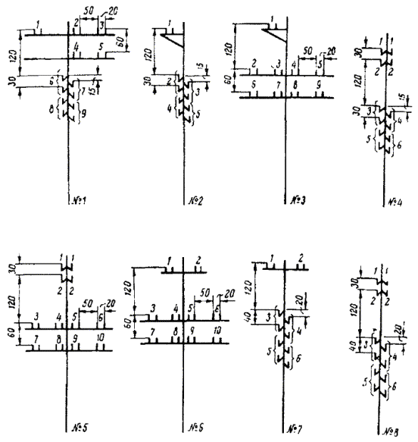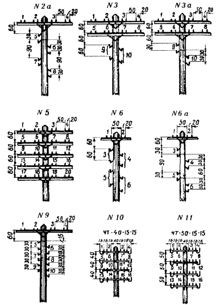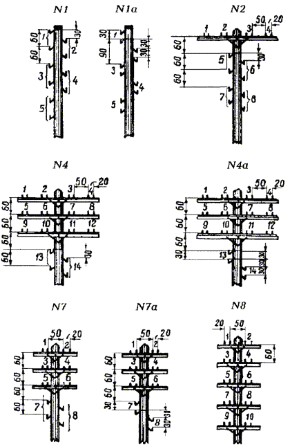 8.3. Типовые профили воздушных линий связи и номера мест цепей на опорах показаны на рис. 8.1 а, б. Рис. 8.1 а. Типовые профили воздушных линий связи