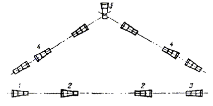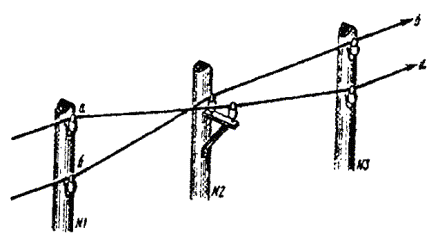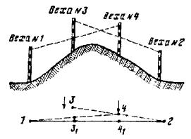 8.30. Для разбивки линии необходимо иметь: а) мерную цепь для промера пролетов или отрезок проволоки, равный длине пролета; б) деревянные вехи длиной 3 - 4 мм; в) деревянные колышки длиной 30 - 40 см, диаметром 3 - 4 см для отметки мест установки опор; г) флажки и свисток для сигнализации; д) топор для заготовки колышков и забивки их в землю; е) стальную саперную лопату. 8.31. Разбивка линии на прямых участках производится с помощью трех вех. В начале линии или в точке изменения направления линии устанавливают веху № 1. На выбранном направлении ставят веху № 2, так чтобы ее было видно со стороны вехи № 1. Около вехи № 1 забивают колышек, обозначающий место установки первой опоры. От вехи № 1 мерной цепью отмеривают расстояние, равное длине пролета. Точное положение второй опоры находят, устанавливая веху № 3 в створе вех № 1 и № 2. Для этой цели веху № 3 передвигают вправо или влево до тех пор, пока она при визировании от вехи № 1 не закроет веху № 2. Место установки второй опоры также отмечают колышком, на котором записывают номер опоры. Таким же образом определяют место установки следующих опор. После разбивки половины расстояния между вехами № 1 и № 2 перемещают веху № 1 на место предпоследнего колышка, не меняя положения вехи № 3, а веху № 2 передвигают вперед на расстояние ясной видимости, но не дальше, чем в точку поворота направления линии, и устанавливают ее в створе вех № 1 и № 3 (рис. 8.14). Рис. 8.14. Разбивка линии на прямых участках 8.32. Если трасса проходит через возвышенность, используют дополнительную (четвертую) веху и место для установки столба находят следующим образом (рис. 8.15): Рис. 8.15. Разбивка линии на пересеченной местности а) веху № 2 устанавливают за возвышенностью, у подножия холма; б) на возвышенное место, в точках, из которых видны одновременно обе вехи (№ 1 и № 2), устанавливают вехи № 3 и № 4. Веху № 4 перемещают до тех пор, пока она не окажется на прямой линии, соединяющей вехи № 3 и № 2; в) затем веху № 3 перемещают до тех пор, пока она не окажется на прямой линии, соединяющей вехи № 1 и № 4; г) последовательным визированием вехи № 3 на веху № 2 и вехи № 4 на веху № 1 добиваются того, чтобы все четыре вехи находились на одной линии; д) разбивку линии между вехами № 1 и № 3, № 3 и № 4, № 4 и № 2 производят, как указано в п. 8.31. 8.33. Если вылет угла больше 15 м, что соответствует внутреннему углу 45 градусов или углу поворота линии 35 градусов, то угол необходимо разбить на два. В населенных пунктах, где указанное требование не может быть выполнено, на угловой опоре для каждого провода нужно устанавливать два штыря ШУ-2Д или два крюка. Для обозначения места установки угловой опоры внутри угла на расстоянии 25 - 35 см от основного колышка забивается второй колышек. Пролеты, смежные с угловой опорой, должны иметь нормальную длину. При числе проводов более четырех и нормальном вылете угла более 5 м длины смежных пролетов должны быть равны половине нормальной. Кроме того, при числе проводов восемь и более опоры, смежные с угловой, укрепляются подпорами или оттяжками. 8.34. При строительстве столбовых линий ГТС разбивку трассы выполняют с учетом следующих дополнительных требований: а) опоры, как правило, должны устанавливаться в пешеходной части улиц; б) расстояние от опоры до бровки тротуара или кювета не должно превышать 0,5 м; в) опоры и их крепления не должны мешать уличном