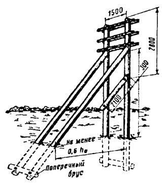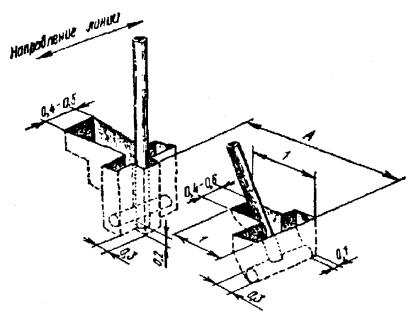 Примечание. В слабых грунтах, а также на склонах холмов более 45 градусов ямы выкапываются на 150 мм глубже. Глубина ям для подпор в грунтах I и II групп должна быть равной 1 м, в грунтах III группы - 0,6 м, IV группы - 0,5 м. Глубина ям для отбойных тумб в грунтах I и II групп - 1 м, III группы - 0,8 м и IV группы - 0,6 м. 8.44. Расположение ям для промежуточных, угловых и оконечных опор при рытье ручным способом показано на рис. 8.17. Ямы для промежуточных и противоветровых опор должны отрываться по направлению линии. При этом отвесные стенки смежных ям должны быть направлены в разные стороны. Ямы для оконечных и угловых опор следует отрывать с отвесной стенкой в сторону натяжения проводов. Колышек, находящийся внутри угла, должен прилегать к отвесной стенке ямы. Для опор, смежных с угловыми и оконечными, ямы должны отрываться так, чтобы отвесные стенки их были обращены в сторону, противоположную угловой и оконечной опорам. Рис. 8.17. Расположение ям для промежуточных, угловых и оконечных опор при рытье ручным способом 8.45. Форма ям для угловых опор с подпорами показана на рис. 8.18. Рис. 8.18. Форма ям для угловых опор с подпорами Расстояние А между ямой для опоры и ямой для подпоры или якоря оттяжки указано в табл. 8.9. Таблица 8.9 Расстояние между ямой для основного столба ямой для подпоры или якоря оттяжки