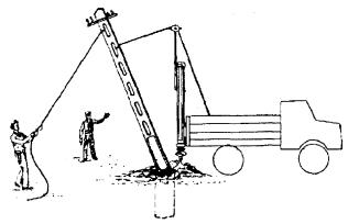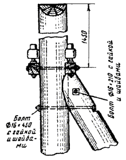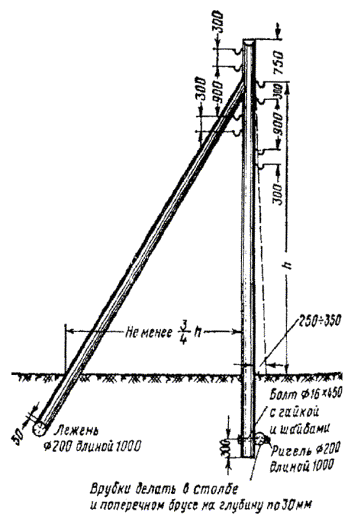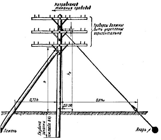 УСТАНОВКА И УКРЕПЛЕНИЕ ОПОР8.46. Установка опор должна производиться бурильно-крановой машиной или автокраном сразу же после отрывки ям. 8.47. При установке опоры с помощью БКГМ ее стропуют подъемным канатом на расстоянии не менее 2/3 длины опоры от комля, после чего с помощью стрелы и лебедки опору поднимают и отпускают в яму (рис. 8.19). Рис. 8.19. Установка опор с помощью БКГМ При этом рабочий-землекоп должен веревкой удерживать вершину опоры и регулировать установку ее в яму. Не снимая подъемного каната, опору следует выверить по вертикали и в створ опор линии, после чего яму засыпать грунтом с послойным трамбованием. 8.48. В тех случаях, когда отсутствует возможность применения машин, установку опор выполняют вручную. При этом оснащенную и подготовленную опору необходимо уложить вдоль линии со стороны ступенек ямы так, чтобы ее комель упирался в доску, установленную у задней отвесной стенки ямы. Рабочие поднимают опору за вершину, затем один из рабочих подпирает ее вертикальную часть рогачом, а остальные, передвигаясь поочередно к середине опоры, поднимают ее при помощи рогачей и багра до тех пор, пока комель опоры не достигнет дна ямы и опора займет вертикальное положение. После подъема опоры доску вынимают из ямы и опору выравнивают в линию с ранее установленными. Промежуточные опоры следует устанавливать по отвесу точно в створе линии. Одновременно с выравниванием поднятой опоры ее кантуют с расчетом, чтобы крюки или траверсы расположились перпендикулярно направлению линии. После окончательного выравнивания опоры яму засыпают грунтом, вырытым при ее выкапывании. Грунт плотно утрамбовывают слоями в 15 - 20 см при помощи механической или ручной трамбовки. Излишек грунта насыпают вокруг опоры в виде конусообразного возвышения и также утрамбовывают. 8.49. До подвески проводов угловая опора должна быть укреплена оттяжкой или подпорой. Оттяжка или подпора устанавливается в плоскости, разделяющей угол между проводами на угловой опоре пополам. Подпора ставится к опоре с внутренней стороны этого угла, оттяжка - с внешней стороны. 8.50. Угловую опору следует устанавливать с некоторым наклоном вершины в сторону, противоположную направлению равнодействующей натяжению проводов или подвешенного кабеля (рис. 8.20). Оттяжки следует изготавливать из стальной оцинкованной проволоки диаметром 4 - 5 мм, свиваемой в жгут. Количество проволок в жгуте зависит от нагрузки и угла поворота линии и может колебаться от двух до семи. Нижний конец оттяжки необходимо закреплять за якорный жгут, который должен быть изготовлен из такой же проволоки, что и оттяжка, и заделан за якорный лежень (рис. 8.21). Рис. 8.20. Угловая опора, укрепленная подпорой (профиль 1 а) Рис. 8.21. Угловая опора, укрепленная подпорой и оттяжкой 8.51. Железобетонные опоры следует укреплять только оттяжками, которые нужно крепить к железобетонным опорам при помощи двухушковых хомутов (рис. 8.22). Рис 8.22. Крепление подкосов и оттяжек к железобетонной опоре Угловую опору нужно укреплять одной оттяжкой, оконечные и кабельные опоры - двумя оттяжками. При этом хомут размещают под первой траверсой. 8.52. Полуанкерные опоры (рис. 8.23) применяются при переходах через железные дороги, на удлиненных пролетах, в качестве вводных и кабельных опор, а также для увеличения устойчивости линии в гололедных районах. Рис. 8.2