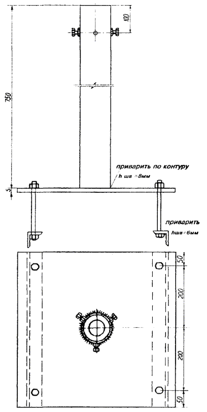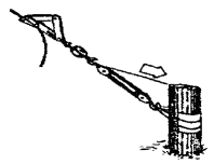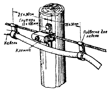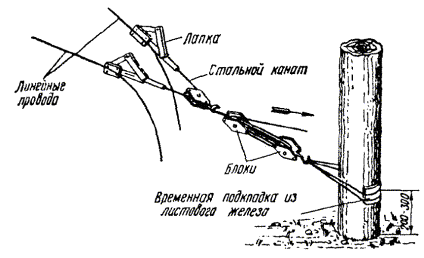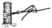 Один конец проволоки зажать в блочную лапку, которую при помощи петли или хомута закрепить у основания опоры