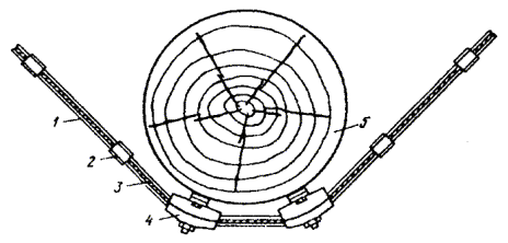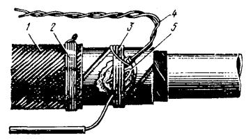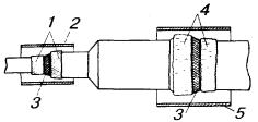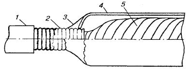 11.81. Подобранные трубки ТУТ разрезаются на отрезки, длина которых должна быть в зависимости от типоразмера: для трубок 40/20 - не менее 100 мм; для трубок 60/30 - 120 мм; для трубок 80/40 - 130 мм; для трубок 100/50 - 150 мм. Линия отреза должна быть перпендикулярна продольной оси трубки. Торцы отрезков, проверяемые внешним осмотром, должны быть ровными, без надрезов, заусенцев, наплывов, раковин, глубоких царапин, которые могут вызвать разрыв трубки во время усадки. 11.82. Отрезки ТУТ обезжириваются бензином Б-70 и надвигаются на кабель до начала разделки концов. На время монтажа сростка их защищают от загрязнения. С внешней стороны торцов частей полиэтиленовой муфты кабельным ножом снимается фаска, а конусы муфты обрезаются так, чтобы она плотно облегала кабель. В муфту вставляются опорные кольца, по два на каждый стык, и подготовленные части муфты надвигаются на кабель. После монтажа сростка жил, восстановления поясной изоляции и экрана полиэтиленовую оболочку кабеля в местах установки конусов муфты, а также стыкуемые детали муфты с внешней стороны обезжиривают бензином Б-70 и зачищают. Затем муфта устанавливается над смонтированным сростком. Для фиксации частей муфты между собой и с оболочкой кабеля на стыки наматываются один на другой три - четыре слоя полиэтиленовой ленты шириной 25 - 40 мм. По обе стороны от намотанной полиэтиленовой ленты на поверхность муфты и оболочки кабеля без зазора накладываются пояски сэвилена или наносится слой клея-расплава. 11.83. Отрезки ТУТ надвигаются на места, предназначенные для их установки, и усаживаются. Места наложения подклеивающего слоя и установки ТУТ показаны на рис. 11.25. Рис. 11.25. Расположение поясков сэвиленовой ленты и слоев клея-расплава на полиэтиленовой муфте: 1 - пояски сэвиленовой ленты; 2 - отрезок ТУТ, подобранный для усадки на конус муфты; 3 - пояски полиэтиленовой ленты; 4 - слои клея-расплава; 5 - отрезок ТУТ, подобранный для усадки на стык частей муфты Усадка ТУТ производится умеренным пламенем горелки, которое кругообразными движениями перемещают вокруг трубки. Сначала усаживается центр трубки (отрезка ТУТ), затем пламя перемещается от центра к одному из концов. После усадки одной половины отрезка ТУТ аналогично усаживают вторую его половину. Особенно тщательно трубка должна прогреваться в местах установки поясков сэвилена или наложения клея-расплава. Прогрев продолжается до полной усадки ТУТ и активного выделения подклеивающего слоя из-под ее торцов. При слабом нажатии на трубку защищенными пальцами руки под ней должно чувствоваться плавление подклеивающего слоя. 11.84. Для восстановления и ремонта оболочек телефонных кабелей применяется двухслойная термоусаживаемая лента «РАДЛЕН», выпускаемая по ТУ-6-19-051-600-86. Она состоит из ленты-основы и герметизирующего подслоя. При герметизации оболочек и муфт телефонных кабелей следует дополнительно применять подклеивающий слой типа ГИПК-14-13 (КРУС-1, КРД). При применении ленты «РАДЛЕН» на соединяемые детали муфты (участок оболочки) наносится расплавленный подслой, на него с легким подогревом наматывают ленту «РАДЛЕН» герметизирующим подслоем внутрь. Каждый виток ленты должен перекрывать предыдущий на 50 %. После намотки ленты весь участок равномерно прогревают до появления расплавленного подслоя из-под витков ленты. ВОССТАНОВЛЕНИЕ РАЗНОРОДНЫХ ОБОЛОЧ