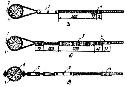 МОНТАЖ МУФТ КАБЕЛЕЙ, ПРОЛОЖЕННЫХ В ГРУНТЕ11.129. Восстановление свинцовых, полиэтиленовых и металлопластмассовых оболочек бронированных кабелей производится теми же способами, что и при монтаже муфт в кабельной канализации. Для защиты муфт от механических повреждений применяются специальные защитные муфты типа МЗС, которые подбираются по наружному диаметру кабеля и габаритам смонтированной муфты. Взамен защитных муфт допускается использование отрезков асбестоцементных труб. 11.130. Бронепокровы концов сращиваемых кабелей должны быть соединены со свинцовой муфтой проволочной перемычкой (рис. 11.37). Если в одной траншее проложено два или несколько бронированных кабелей, их свинцовые оболочки должны быть соединены между собой. Для этого из муфт, расположенных в одном котловане, выводят изолированные провода, жилы которых соединены с оболочками кабелей. Рис. 11.37. Устройство перемычки между бронепокровами концов кабелей и свинцовой муфтой В случаях, когда проектом предусмотрена установка контрольно-измерительного пункта (КИП), изолированные провода включают в щиток КИП, вмонтированнный в замерный столбик. Подробно технология монтажа кабелей, проложенных непосредственно в грунте, изложена в «Руководстве по строительству линейных сооружений магистральных и внутризоновых кабельных линий связи», раздел 8 (М. «Радио и связь», 1986). ОСОБЕННОСТИ МОНТАЖА МУФТ ПОДВЕСНЫХ КАБЕЛЕЙ11.131. Муфты подвесных кабелей и сростки стальных канатов должны размещаться, по возможности, около опор (рис. 11.3), а муфты подвесных кабелей с встроенным канатом - как показано на рис. 11.38. Монтаж сростка и восстановление оболочки осуществляется способами, принятыми для кабелей данного типа. При восстановлении оболочки с применением газовой горелки или паяльной лампы во избежание провисания проволоки или каната, необходимо снять прилегающие к муфте два - три подвеса с каждой стороны. Рис. 11.38. Размещение муфты подвесного кабеля с встроенным стальным канатом: 1 - коуш; 2 - винтовая стяжка; 3 - крюк КН-18; 4 - подвесной крюк; 5 - канат (заземлить) 11.132. При монтаже кабеля со встроенным канатом сращивание концов каната производится при помощи стальной гильзы (рис. 11.39, а) или клеммы (рис. 11.39, б). Рис. 11.39. Сращивание концов стального каната при помощи: а) стальной гильзы; б) клеммы из двух плашек Освобожденный от оболочки конец каната вводят в гильзу на половину ее длины. На расстоянии 8 мм от конца гильзу сжимают пресс-клещами типа ПК-1, в которые установлены соответствующие пуансон и матрица. Затем в гильзу с другой стороны вводят второй конец каната и также сжимают клещами. Далее гильзу дополнительно сжимают между участками первоначального сжатия. Основные размеры стальных гильз приведены в табл. 11.16. При сращивании концов каната при помощи клеммы их помещают между двумя плашками, изготовленными из полосовой стали толщиной 4 - 5 мм, и сжимают болтами. При всех видах соединения канатов их оголенные участки, стальную гильзу или клемму покрывают лаком «Кузбасс» или битумным лаком № 177. Таблица 11.16 Размеры стальных гильз для соединения стального каната кабелей ТППт