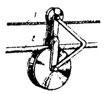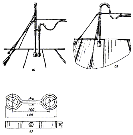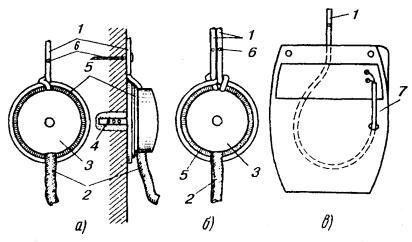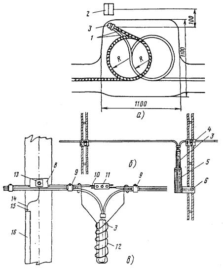 Рис. 8.52 б. Двойной ролик для подвески кабеля: 1 - стальной канат; 2 - кабель Рис. 8.53. Выкладка и расположение муфт на подвесных кабелях: а - при монтаже разветвительной муфты; б - при монтаже соединительной муфты; в - при монтаже муфты на кабеле со встроенным тросом (канатом); 1 - столбовая опора; 2 - столбовая консоль; 3 - отдельный подвесной канат; 4 - основной подвесной кабель; 5 - ответвляющиеся кабели; 6 - дужки запаса; 7 - подвесы из оцинкованной стали; 8 - муфта разветвительная; 9 - муфта соединительная; 10 - кабель со встроенным тросом; 11 - трос (в полиэтиленовом шланге), отделенный от кабеля; 12 - сросток троса; 13 - стяжки из каната или стальной оцинкованной проволоки; 14 - полиэтиленовые прокладки Кабели со встроенным канатом подвешивают в указанной выше последовательности, с той разницей, что при этом исключаются работы по раскатке и подвеске стального каната. Встроенный канат закрепляют в специальной столбовой консоли так, как это показано на рис. 8.54. Рис. 8.54. Стальная столбовая консоль для подвески кабеля со встроенным стальным канатом: а - на промежуточной опоре; б - на угловой опоре; в - разрез: 1 - кабель со встроенным стальным канатом; 2 - стальная консоль; 3 - опора; 4 - проволочный хомут; 5 - крепежный болт 8.90. Стальной канат, на котором подвешен кабель, должен быть заземлен в начале и в конце линии, а также через каждые 250 м. Таблица 8.18 Типы стальных канатов для подвески кабелей местных сетей на столбовых опорах и нормируемые стрелы провеса