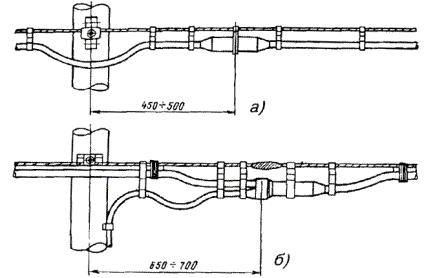 11.133. Монтируемые концы кабелей отводят от каната и с плавным изгибом укладывают параллельно друг другу на расстоянии 100 - 150 мм от каната и производят монтаж муфты. В местах обрезов перемычек на кабель и канат наматывают три - пять слоев липкой или сухой пластмассовой ленты шириной 20 - 25 мм, поверх которой накладывают бандажи из четырех - пяти витков стальной перевязочной проволоки диаметром 1,5 мм. На расстоянии 30 - 50 мм от концов муфты кабель крепят к канату подвесами из оцинкованной стали. Под подвесами на оболочку кабеля наматывают пластмассовую ленту шириной, превосходящей ширину подвеса на 10 - 15 мм. 11.134. Канат подвесного кабеля заземляют в начале и в конце линии, на кабельных опорах, а также на промежуточных опорах, через каждые 250 м. Заземляющий провод подключают к канату при помощи клеммы или посредством пайки с концом стальной перевязочной проволоки диаметром 1,0 - 1,5 мм, намотанной на канат на длине 50 - 60 мм. Оголенные участки каната и участок намотки покрывают лаком «Кузбасс» или битумным лаком № 177. Пайка заземляющего провода допускается непосредственно к свободному концу троса, закрепленному на опоре оконечной заделкой. ОСОБЕННОСТИ МОНТАЖА КАБЕЛЕЙ, ПРОЛОЖЕННЫХ ПО ВНУТРЕННИМ И НАРУЖНЫМ СТЕНАМ ЗДАНИЙ11.135. Монтаж муфт кабелей, проложенных по стенам зданий, следует производить так, чтобы не нарушать прямолинейности и четкости линий кабелей и муфт. Не допускается волнистость кабелей, чрезмерное выпячивание муфт, заметные неровности муфт. В стеновом основании для муфты рекомендуется делать штробу. После разметки и разделки концов кабелей их снимают по обе стороны от места сращивания с трех - четырех скреп и укладывают так, чтобы фиксировалось расстояние между обрезами оболочек. Муфту монтируют обычным способом и, если позволяет материал стены (штукатурка, кирпич), укладывают в штробу. Кабель закрепляют на скрепах, с которых он был снят. Строительным гипсом подправляют штробу. Монтаж распределительных кабелей в пластмассовых оболочках емкостью до 100´2 включительно внутри сухих помещений допускается выполнять без сварки. Части муфт между собой и с оболочкой кабеля соединяются на стыках четырьмя - шестью слоями липкой пластмассовой ленты. МОНТАЖ ОКОНЕЧНЫХ КАБЕЛЬНЫХ УСТРОЙСТВ11.136. К оконечным устройствам местных телефонных сетей относятся: · коробки распределительные 10´2 типов КРТ и КРТП (КРО), устанавливаемые соответственно в неотапливаемых и отапливаемых помещениях; · кабельные ящики 10´2 и 20´2, устанавливаемые на кабельных опорах, или на чердаках, вблизи стоечных опор; · боксы кабельные телефонные 10´2, 20´2, 30´2, 50´2 и 100´2, устанавливаемые в распределительных телефонных шкафах на магистральных и распределительных кабелях; · защитные полосы, устанавливаемые на кроссах абонентских линий телефонных станций, состоящие из секций 25´2, которые набираются по 4 - 8 шт. в одной вертикали; · рамки 40´2, 15´2, 10´3, устанавливаемые на кроссах соединительных линий для включения кабелей межстанционных связей; · распределительные блоки мини-кросса 100´2 для включения абонентских и межстанционных линий. МОНТАЖ РАСПРЕДЕЛИТЕЛЬНЫХ КОРОБОК 10´211.137. Монтаж (зарядка) распределительных коробок 10´2 производится кабелями 10´2 (5´4) преимущественно марок ТПП, ТППэп, но допускается и ТПВ, а в особо оговоренных проектом случаях - марки ТГ с бумагомассной изоляци