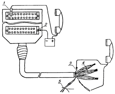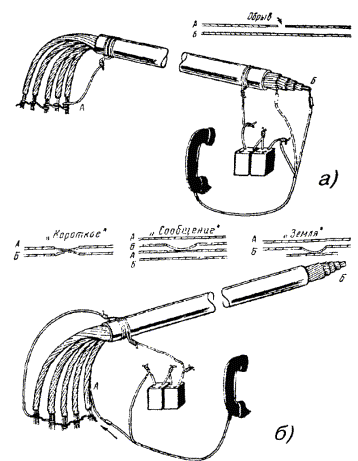 14.22. Сосредоточенная омическая асимметрия. Для определения расстояния до места сосредоточенной омической асимметрии (Rа) применяется метод моста короткого замыкания с использованием весьма низкой частоты, реализованный в приборе ПКП-4. Погрешность измерения ±5 % при Rа < 5 Ом и ±3 % - при Rа ³ 5 Ом. 14.23. Разбитость пар. При монтаже кабелей связи возможны ошибки в соединении жил, заключающиеся в том, что какая-либо жила одной пары соединяется с жилой другой пары. Такие пары называются разбитыми. Расстояние до места разбитости пар определяется импульсным методом и методом моста переменного тока. Импульсный метод дает возможность определять места одной или нескольких разбитостей пар. При этом методе в одну из разбитых пар с выхода прибора подается зондирующий импульс. Импульс, распространяясь по линии, доходит до места разбитости, которое характеризуется резким увеличением электромагнитной связи между парами. В результате этого импульс переходит из первой пары во вторую, которая подключена ко входу прибора, и возвращается к началу линии. На экране ЭЛТ появляется отраженный импульс (выброс), соответствующий резкому уменьшению переходного затухания в месте разбитости. Если в кабеле имеется несколько мест разбитости, то на экране ЭЛТ будут видны импульсы, соответствующие местам разбитости пар. При определении мест разбитости пар импульсным методом применяются приборы типа Р6. Метод моста переменного тока применяется, если жилы перепутаны в одной или двух муфтах. Измерение производится на частоте 10 или 25 Гц (при длине участка более 3 км) и 800 Гц (при длине участка менее 3 км). При определении мест разбитости пар методом моста переменного тока применяются приборы ПКП-4 и ПКП-5. Погрешность определения расстояния ±1,5 % от длины линии. 14.24. Понижение электрической прочности изоляции. Для определения расстояния до места повреждения применяются высоковольтные мосты постоянного тока. Уравновешивание моста производится в моменты пробоя изоляции. Высоковольтные мосты бывают с непосредственным отсчетом расстояния по показателям моста (Р41270 с источником напряжения П4110) и с отсчетом по показаниям моста коэффициента пропорциональности, по которому рассчитывается расстояние (ВВМ-77, входящий в комплект КОП). Определение места снижения электрической прочности изоляции (места пробоя изоляции) производится на трассе кабеля. Основными методами отыскания места пробоя являются индукционный и акустический. Индукционный метод основан на прослеживании вдоль трассы кабеля изменения напряженности магнитного поля тока, протекающего по кабелю. В месте пробоя происходит резкое изменение напряженности магнитного поля. Определение места пробоя изоляции индукционным методом производится комплектом КОП, в состав которого, кроме высоковольтного моста ВВМ-77, входят усилитель универсальный оконечный УУО и набор индукционных датчиков (щупов): ЩАВ - щуп активный выносной - применяется при определении мест пробоя с поверхности грунта; ЩАБ - щуп активный болотный - применяется при определении мест пробоя в кабелях, проложенных в болотах; ЩАН - щуп активный накладной - применяется для уточнения места пробоя на открытых кабелях (путем наложения щупа на кабель). Акустический метод определения места пробоя основан на прослеживании вдоль трассы изменения интенсив