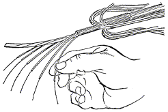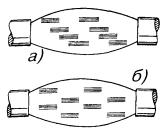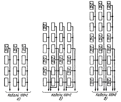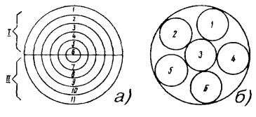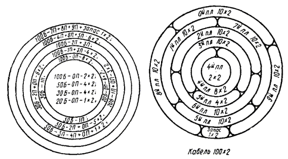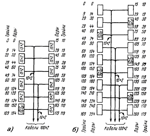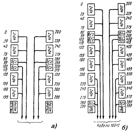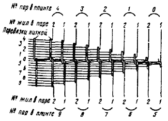 Примечание. В числителе указана длина разделки троса, а в знаменателе - длина удаляемого участка оболочки троса. Перемычка между оболочкой кабеля и оболочкой каната прорезается кабельным ножом. На оболочке каната для ее удаления выполняют круговые и продольные надрезы, или просто срезают ее ножом. При необходимости канат укорачивается до нужного размера, для чего на расстоянии 5 - 7 мм от места будущего обреза на проволоки каната накладывается бандаж из 4 - 5 витков стальной проволоки, а затем проволоки каната надпиливают и обламывают. МОНТАЖ СЕРДЕЧНИКОВ ГОРОДСКИХ КАБЕЛЕЙ11.36. Сердечники кабелей до начала сращивания жил разбирают на пучки, концы которых плотно перевязывают обрезками жил. В кабелях повивной скрутки сердечники разбираются по полуповивам. Для этого каждый повив делится на два пучка: ближний и дальний. В ближний отбираются примерно 60 % групп (пар или четверок), а в дальний - 40 %. При разборке повивов счетные группы обоих кабелей должны попасть в одноименные пучки (рис. 11.8). Рис. 11.8. Очередность монтажа групп жил сердечника: а) повивной скрутки (по полуповивам); б) пучковой скрутки (по главным пучкам) Образованные из полуповивов пучки жил кабелей увязываются в две косоплетки: «ближнюю» и «дальнюю». По окончании разборки они объединяются в одну, и на каждом конце кабеля образуется большая косоплетка, в которой пучки увязаны в порядке, обратном очередности их монтажа. 11.37. Сердечники кабелей пучковой скрутки разбирают на главные пучки, их подвязывают к кабелю в порядке, обратном очередности их монтажа. Наиболее удаленный от спайщика главный пучок оставляют неподвязанным и разбирают его на элементарные пучки, которые увязывают в косоплетку в порядке, обратном очередности их монтажа. Группы в элементарных пучках разбирают в процессе монтажа. (Если главные пучки кабелей имеют повивную скрутку групп, то группы в главных пучках разбирают по полуповивам.) 11.38. При сращивании кабеля повивной скрутки с кабелем пучковой скрутки из сердечника кабеля повивной скрутки отбирают пучки групп, соответствующие числу групп в главных пучках кабеля пучковой скрутки. Запасные (резервные) пары (четверки) кабелей пучковой скрутки, расположенные между главными пучками, при разборке подвязывают к оболочкам отдельно. Эти пары соединяют в последнюю очередь. 11.39. При разделке кабелей типа ТП с переменным направлением скрутки жил следует увеличить длину оставляемых для разделки концов с таким расчетом, чтобы в соединительной муфте длина освобождаемого от оболочки сердечника была не менее 1 м, а в сборной муфте - не менее 1,2 м. Во время разборки сердечника следует соблюдать осторожность, чтобы не допустить рассыпания пар. Оболочку с кабеля сначала удаляют на участке длиной 500 мм. 11.40. Сердечник кабеля при разматывании экранной ленты и поясной изоляции должен быть скреплен на конце бандажом из обрезков жил. После чего он разбирается на главные пучки, каждый из которых, в свою очередь, также скрепляется бандажом. При разборе следует избегать резких изгибов главных пучков. Затем главные пучки разбирают на элементарные 10´2 пучки. При этом следует выделять пучки с трудноразличимой скруткой, а пучки с заметной скруткой сразу увязывать в порядке, обратном очередности монтажа. Для отбора пар на пучок с трудноразличимой скруткой накладывают несколько бан