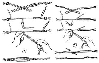 11.45. Процесс сращивания жил ручной скруткой показан на рис. 11.10. Рис. 11.10. Процесс сращивания жил ручной скруткой: а) с изолированием индивидуальными гильзами; б) с изолированием общей гильзой Перед сращиванием на жилы надеваются гильзы. В процессе сращивания одноименные жилы скрещивают и скручивают на два оборота вместе с изоляцией. Начиная от места скрутки жил в изоляции на расстоянии 30 - 40 мм изоляцию с жил удаляют бокорезами. Оголенные участки жил складывают вместе, сжимают пальцами одной руки и 8 - 10 кругообразными движениями другой руки свивают на длине 15 - 25 мм в зависимости от диаметра жил кабеля. Лишние концы жил обрезают. Длина обрезанной скрутки не должна быть меньше размера, указанного в табл. 11.4. Таблица 11.4 Зависимость длины скрутки от диаметра жил кабеля