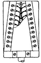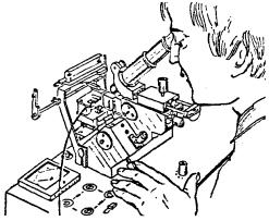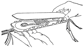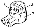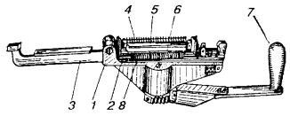 11.49. Скрутки пропаиваются припоем ПОССУ-40 с применением в качестве флюса раствора канифоли в спирте (три весовые части канифоли на семь частей спирта). Пайку скруток производят в стаканчиковом паяльнике, разогреваемом пламенем газовой горелки или паяльной лампы. Перед пайкой концы скруток смазывают на длине 8 - 10 мм раствором канифоли в спирте при помощи мягкой кисточки. Концы скруток погружаются в расплавленный припой на 2 - 3 см. Длина пропаянного участка скрутки должна составлять 5 - 8 мм. Пропайка производится группами по 6 - 8 пар по мере сращивания. 11.50. Способ сращивания жил с помощью многопарных соединителей, при котором за один прием сращиваются 10 или 25 пар без предварительного снятия изоляции и применения изолирующих гильз, обеспечивает высокое качество монтажа и повышение производительности труда по сравнению с ручной скруткой жил. 11.51. Соединители СМЖ-10 отечественного производства применяются для сращивания жил городских телефонных кабелей с полиэтиленовой и бумагомассной изоляцией. Не рекомендуется применение соединителей для монтажа кабелей типа Т с трубчато-бумажной изоляцией. Соединитель СМЖ-10 (рис. 11.13) состоит из двух половин: нижней (2), которая содержит все металлические контактные элементы, и верхней (3), имеющей пазы и выступы, служащие для вдавливания в щели контактных элементов нижней половины сращиваемых жил (1) и их фиксации. Рис. 11.13. Соединитель СМЖ-10: 1 - сращиваемые жилы, 2 - основание соединителя, 3 - крышка соединителя 11.52. Выпускаются два вида соединителей СМЖ-10: · для сращивания жил диаметром 0,32 и 0,4 мм с шириной прорези 0,26 - 0,29 мм; · для сращивания жил диаметром 0,5 и 0,7 мм с шириной прорези 0,39 - 0,43 мм. При сращивании жил разного диаметра, например, при монтаже станционных разветвительных муфт, соединители подбираются для меньшего диаметра жил. Цвет корпуса соединителя определяет его назначение. Соединители белого цвета предназначены для жил диаметром 0,32 и 0,4 мм; любого другого цвета (кроме черного) - для жил диаметром 0,5 и 0,7 мм. Соединители поставляются в полиэтиленовых пакетах, по 100 штук в каждом. В пакет вкладывается бланк предприятия-изготовителя с техническими данными соединителей и свидетельством ОТК о приемке. 11.53. Опрессовка соединителей и одновременно с этим обрезание излишков жил производится с помощью ручной пресс-техники ПСМЖ-200 (рис. 11.14) с соблюдением следующей технологической последовательности. Основание соединителя закладывается в соответствующее гнездо пресса. Сращиваемые концы жил заводятся в гнездо соединителя и устанавливаются над прорезями контактной пластины. Жилы фиксируются на штырях разделительной гребенки, концы жил зажимаются в спиральной пружине. Затем основание соединителя накрывается крышкой. Крышка прижимается откидной планкой пресс-техники. Поворотом рукоятки пресса части соединителя сжимаются и надежно фиксируются в таком положении. При этом контактные пластины приходят в соприкосновение с жилами, сдавливают их, прорезают изоляцию и внедряются в тело проводников. В результате обеспечивается надежный электрический контакт между сращиваемыми жилами. Обжатый соединитель извлекают из пресса, и таким же образом монтируется следующий соединитель. Рис. 11.14. Ручная пресс-техника ПСМЖ-200: 1 - корпус, 2 - кронштейн, 3 - планка, 4 - делитель, 5 - толкатель, 6 - нож, 7 - рукоятка, 8 - пруж