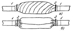 ВОССТАНОВЛЕНИЕ ПОЯСНОЙ ИЗОЛЯЦИИ И ЭКРАНА11.62. Поясная изоляция на кабелях с бумажной изоляцией жил восстанавливается миткалевой лентой шириной 60 - 80 мм (рис. 11.20, а) или кабельной бумагой (рис. 11.20, б). Ширина подготовленной полосы кабельной бумаги должна превышать длину сростка на 100 - 120 мм, в зависимости от размера сростка. Перед восстановлением поясной изоляции сросток кабеля просушивается горячим воздухом над пламенем газовой горелки. При этом над сростком устанавливается отражающий козырек из кабельной бумаги. Одновременно со сростком должен просушиваться материал, предназначенный для восстановления поясной изоляции. Для этого сросток слегка распушивается, и миткалевая лента, свернутая в рулон, укладывается на сросток. Если поясная изоляция восстанавливается кабельной бумагой, то полосу этой бумаги используют в качестве отражающего козырька. Сросток просушивается в течение 10 - 15 минут, а затем плотно обматывается двумя слоями прошпаренной миткалевой ленты с перекрытием в 15 - 20 мм. Рис. 11.20. Восстановление поясной изоляции на кабелях типа Т: а) миткалевой лентой; б) кабельной бумагой 1 - отметки местонахождения конусов свинцовой муфты; 2 - перевязки из суровых ниток Конец полосы кабельной бумаги вставляется в сросток, сросток обматывается двумя-тремя слоями бумаги и уплотняется сворачиванием бумажной полосы. На краях сростка бумага обжимается руками. Концы миткалевой ленты и кабельная бумага закрепляются на сростке перевязками из ниток. 11.63. При восстановлении элементов кабелей с полиэтиленовой изоляцией жил (рис. 11.21) прежде всего должны использоваться ленты поясной изоляции и экрана кабеля, которые на стадии разделки сматывались в рулоны. Смонтированный и отформованный руками сросток жил плотно обматывают встречными лентами поясной изоляции с перекрытием в 20 мм. Концы лент закрепляют перевязкой из ниток или обрезков жил. При невозможности размотать на ленты поясную изоляцию кабеля допускается использование в этом качестве полиэтиленовой ленты; при этом сросток должен закрываться двумя ее слоями с 50 % перекрытием. Рис. 11.21. Восстановление поясной изоляции и экрана кабелей типа ТП: а) восстановление поясной изоляции; б) восстановление экранной проволоки; в) восстановление экрана с использованием экранных лент кабеля ТПП; г) соединение экранных лент кровельным швом; д) восстановление экрана на кабеле ТППэп с использованием алюминиевой фольги Концы экранной проволоки по спирали наматывают навстречу друг другу на закрытый поясной изоляцией сросток и в середине его соединяют ручной скруткой. Длина скрутки должна быть не менее 20 мм. Скрутка изолируется гильзой и затем сгибается пополам (рис. 11.21, б). Собранные в рулоны экранные ленты наматываются на сросток с 50 % перекрытием. В середине сростка они соединяются кровельным замком (рис. 11.21, в, г). На кабелях с экранами продольного наложения и кабелях марки ТППэп экран восстанавливается предварительно заготовленными экранными лентами, снятыми с концов кабелей ТПП, или алюминиевой фольгой. Экранная лента наматывается на сросток так же, как и в предыдущем варианте. Длина ленты должна обеспечивать обмотку сростка без соединений. Края ленты должны заходить на оголенные участки продольного экрана не менее, чем на 10 мм. На такое же расстояние должна перекрывать их и алюминиева