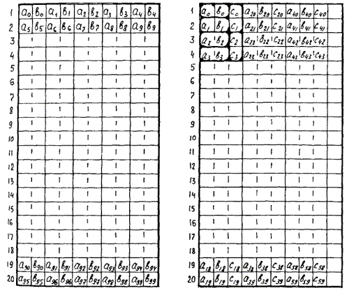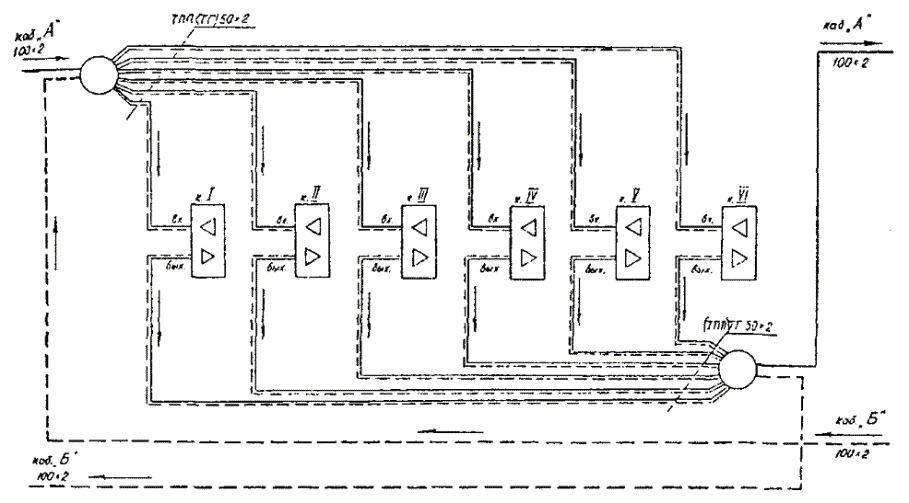 СИСТЕМА ПЕРЕДАЧИ ИКМ-120-4. МОНТАЖ КОНТЕЙНЕРОВ НРП-613.29. Комплекс аппаратуры вторичной системы передачи ИКМ-120-4 предназначен для эксплуатации на городских сетях связи по симметричным семи- или четырехчетверочным кабелям типа МКС по одно- или двухкабельной схеме и обеспечивает организацию ста двадцати телефонных каналов в одном линейном тракте методом импульсно-кодовой модуляции, объединяя четыре цифровых потока со скоростью передачи 2048 кбит/с в один цифровой поток со скоростью передачи 8448 кбит/с. 13.30. Расстояние между регенерационными пунктами составляет: · при однокабельной системе................................................................ 0,5 - 2,0 км; · при двухкабельной системе................................................................ 0,5 - 3,2 км. Максимальная длина линейного тракта 100 км. 13.31. Промежуточное оборудование линейного тракта размещается в контейнерах НРП-6. В состав оборудования НРП-6 входят следующие блоки: · 12 односторонних линейных регенераторов (РЛ), · 1 блок контроля регенераторов (КР-21). Конструктивно контейнер НРП-6 выполнен так же, как и контейнер НРП-12. Порядок приемки оборудования НРП-6 от заказчика и установки контейнера на кабельную линию такой же, как и для контейнера НРП-12. 13.32. Однокабельный вариант включения контейнера в кабель МКС 7´4´1,2 показан на рис. 13.6. Если проектом не предусмотрено строительство специального колодца, контейнер может быть установлен в основном колодце, который при этом должен быть оборудован защитным заземлением. Контейнер устанавливается на фундамент размером 500´500 мм, состоящий из двух слоев кирпича, или на железобетонную плиту таких же размеров с четырьмя вмазанными штырями диаметром 8 мм под отверстия в днище контейнера. 13.33. Включение уплотняемых пар производится монтажом двух прямых свинцовых муфт на патрубках контейнера и одной разветвительной муфты на три направления. Сердечник кабеля разбирается по четверкам (рис. 13.7, а): центральная четверка используется для служебной связи и телеконтроля; вторая, третья и четвертая четверки - для направления передачи от станции А; пятая, шестая и седьмая четверки - для противоположного направления. В кабеле цвет счетной четверки - красный, цвет четверки направления счета - зеленый. Расположение рабочих пар внутри четверки показано на рис. 13.7, в. Цвет изоляции жил первой рабочей пары - красный и желтый; второй рабочей пары - зеленый и синий. 13.34. Оконечным устройством для кабеля, оснащаемого аппаратурой ИКМ-120-4, является бокс типа БМ с плинтами ПЭ-6, установленный в помещении систем передач. 13.35. Двухкабельный двухконтейнерный вариант включения контейнера показан на рис. 13.8, а, а двухкабельный одноконтейнерный вариант - на рис. 13.8, б. Включение линейного кабеля в плату ОЛП при двухкабельном двухконтейнерном варианте представлено в табл. 13.1, а при двухкабельном одноконтейнерном варианте - в табл. 13.2. 13.36. Назначение четверок в кабеле МКС 7´4´1,2 для двухкабельного одно- и двухконтейнерного вариантов включения показано на рис. 13.7, б. МАРКИРОВКА И НАЗНАЧЕНИЕ ЦЕПЕЙ КОНТЕЙНЕРА НРП-6