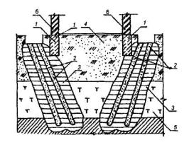 Рекомендации по обследованию и мониторингу технического состояния эксплуатируемых зданий, расположенных вблизи нового строительства или реконструкции. Москомархитектура, 1998. Рекомендации по проектированию и устройству оснований и фундаментов при возведении зданий вблизи существующих в условиях плотной застройки в г. Москве. Москомархитектура, 1999. Рекомендации по расчету, проектированию и устройству свайных фундаментов нового типа в г. Москве. Москомархитектура, 1997. Рекомендации по проектированию и устройству оснований, фундаментов и подземных сооружений при реконструкции гражданских зданий и исторической застройки. Москомархитектура, 1995. Методика инженерно-геологических изысканий в центре и серединной части г. Москвы. Москомархитектура, 2000. Инструкция по проектированию и устройству свайных фундаментов зданий и сооружений в г. Москве. Москомархитектура, 2001. Инструкция по инженерно-геологическим и геоэкологическим изысканиям в г. Москве. Москомархитектура, 2004. Инструкция по нивелированию I, II, III и IV классов, ГКИНП (ГНТА) - 03-010-03, М., ЦНИИГАиК, 2004. Инструкция по проведению технологической поверки геодезических приборов, ГКИНП (ГНТА) 17-195-99, М., 1999. Руководство по наблюдениям за деформациями оснований и фундаментов зданий и сооружений, М., Стойиздат, 1975. Постановление Правительства Москвы от 7 декабря 2004 г. N 857-ПП "Об утверждении Правил подготовки и производства земляных работ, обустройства и содержания строительных площадок в городе Москве". Приложение 2Примеры конструктивных решений по усилению и реконструкции оснований и фундаментовУСТРОЙСТВО ПЕСЧАНЫХ СВАЙ ДЛЯ ГЛУБИННОГО УПЛОТНЕНИЯ ОСНОВАНИЯ1- существующие фундаменты; 2- песчаные сваи; 3- зоны уплотнения; 4- насыпной грунт; 5- торф; 6- кирпичные стены. Рис. 1. ЗАКРЕПЛЕНИЕ КИРПИЧНОЙ И БУТОВОЙ КЛАДКИ ТОРКРЕТ-БЕтОНОМ