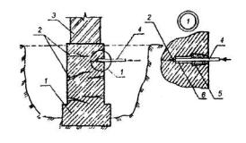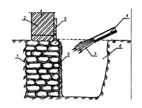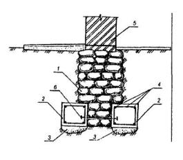 1 - существующий фундамент, имеющий расслоение кладки; 2 - кирпичная стена с разрушенным поверхностным слоем; 3 - набрызг бетонной смеси под высоким давлением; 4 - цемент-пушка (или бетон-шприц-машина); 5 - торкретируемая поверхность; 6 - шурф. Рис. 2. ЗАКРЕПЛЕНИЕ БУТОВОЙ КЛАДКИ ФУНДАМЕНТА ЦЕМЕНТАЦИЕЙ