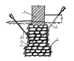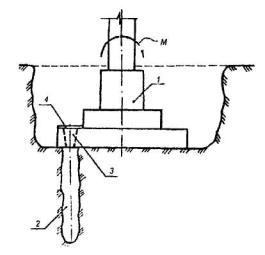 1 - усиливаемый столбчатый фундамент; 2 - анкеры из буронабивных армированных свай, работающих на выдергивание (диаметр сваи 150-200 мм, длина 2-3 м); 3 - конусные отверстия в плитной части фундамента, заполняемые в последующем бетоном; 4 - металлические пластины, к которым приваривается арматура анкеров. Рис. 25. ПЕРЕДАЧА НАГРУЗКИ ОТ СТЕНЫ НА НАБИВНЫЕ СВАИ