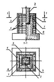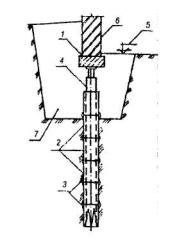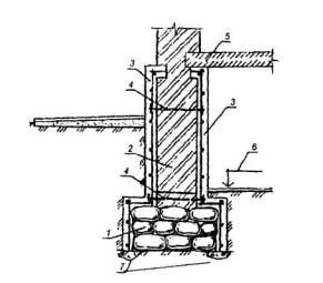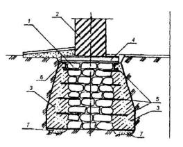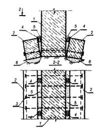 1 - усиливаемый фундамент; 2 - инъекторы для нагнетания подвижного (жидкого) цементного раствора; 3 - наплывы раствора; 4 - кирпичная стена. Рис. 3. ЗАКРЕПЛЕИЕ БЕТОННЫХ (ЖЕЛЕЗОБЕТОННЫХ) ФУНДАМЕНТОВ ИМЕЮЩИХ ТРЕЩИНЫ, СИНТЕТИЧЕСКИМИ СМОЛАМИ 1 - существующий фундамент, имеющий вертикальные и горизонтальные трещины; 2 - трещины; 3 - кирпичная стена; 4 - инъектор для нагнетания компаунда из синтетических смол под давлением 0,6-1,2 МПа; 5 - борозда шириной 35-40 мм, выполненная дисковой пилой или отбойным молотком; 6 - отверстие, пробуренное перфоратором на глубину 100-150 мм. Рис. 4. УСТРОЙСТВО ЖЕЛЕЗОБЕТОННОЙ ОБОЙМЫ ДЛЯ ЛЕНТОЧНОГО БУТОВОГО ИЛИ КИРПИЧНОГО ФУНДАМЕНТА 1 - усиливаемый бутовый фундамент; 2 - усиливаемая кирпичная стена; 3 - железобетонная обойма; 4 - анкеры; 5 - надподвальное перекрытие; 6 - отметка пола подвала; 7 - зона обжатого грунта основания. Рис. 5. УСТРОЙСТВО ЖЕЛЕЗОБЕТОННОЙ ОБОЙМЫ ВОКРУГ ПОДКОЛОННИКА