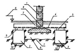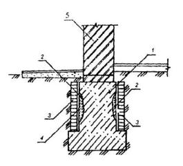 1 - усиливаемые фундаменты; 2 - плита перекрытия; 3 - опорная рамная конструкция из железобетона или металла; 4 - дополнительный фундамент из сборных плит; 5 - зона уплотненного грунта. Рис. 20. ПОДВЕДЕНИЕ РАЗГРУЖАЮЩИХ ЭЛЕМЕНТОВ ДЛЯ ПЕРЕДАЧИ ЧАСТИ НАГРУЗКИ ОТ СТЕНЫ НА ПРОЧНЫЙ СЛОЙ ОСНОВАНИЯ 1 - сборный ленточный фундамент; 2 - дополнительные опоры-фундаменты; 3 - монолитные железобетонные балки усиления; 4 - рабочая арматура балок; 5 - подкладки; 6 - отметка пола подвала; 7 - слой грунта с наибольшей несущей способностью; 8 - отверстие между фундаментными блоками для пропуска рабочей арматуры балок; 9 - слой слабого грунта; 10 - зоны уплотненного грунта. Рис.21. ПЕРЕДАЧА НАГРУЗКИ ОТ ФУНДАМЕНТА НА БУРОИНЪЕКЦИОННЫЕ СВАИ1 - усиливаемый столбчатый фундамент; 2 - буроинъекционные (корневидные) сваи диаметром 100-250 мм, устраиваемые через плитную часть усиливаемого фундамента; 3 - арматурные каркасы; 4 - конусные отверстия в плитной части фундамента; 5 - железобетонная колонна. Рис. 22. ПЕРЕДАЧА НАГРУЗКИ ОТ СТЕНЫ НА БУРОИНЪЕКЦИОННЫЕ СВАИ