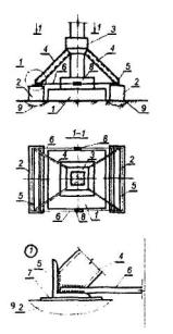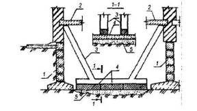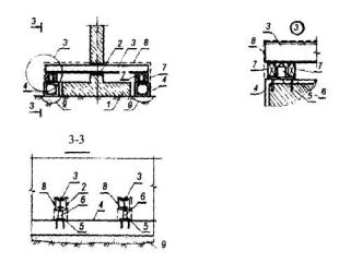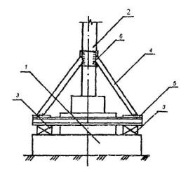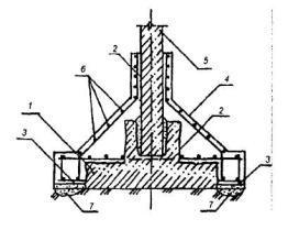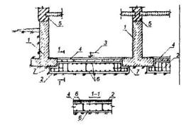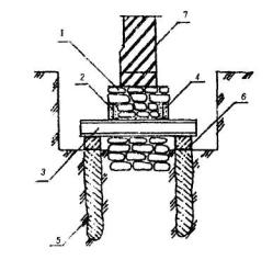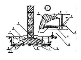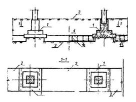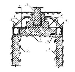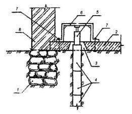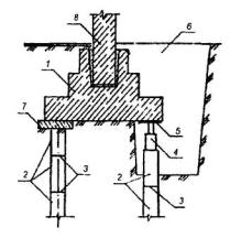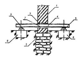 1 - подколенная часть фундамента; 2 - колонна; 3 - железобетонная обойма усиления подколонной части фундамента; 4 - поперечные арматурные сетки обоймы; 5 - вертикальные арматурные стержни обоймы; 6 - поверхность подколонника, подготовленная к бетонированию (зачистка и насечка). Рис. 6. УСТРОЙСТВО ЗАЩИТНЫХ СТЕНОК 1 - усиливаемый фундамент; 2 - участки разрушения в результате действия агрессивной среды в грунте (поднятие уровня грунтовых вод, поступление химических продуктов и др.); 3 - защитная стенка из кирпича, устанавливаемая после восстановления участков разрушения; 4 - обмазочная или оклеечная гидроизоляция; 5 - кирпичная стена. Рис. 7. УСТАНОВКА ПОДКОСОВ С ЗАТЯЖКАМИ 1 - усиливаемый фундамент; 2 - элементы усиления фундамента; 3 - металлическая или железобетонная обойма вокруг колонны; 4 - подкос из прокатного металла; 5 - опора подкосов из уголка; 6 - затяжка; 7 - пластина-подкладка; 8 - муфта натяжения; 9 - зона обжатого грунта основания. Рис. 8. УСТАНОВКА ГИДРОДОМКРАТОВ 1 - усиливаемый фундамент; 2 - проемы в стене фундамента для установки балок; 3 - поперечные балки; 4 - железобетонные разгружающие пояса; 5 - закладные детали, установленные при бетонировании поясов; 6 - гидродомкраты для включения разгружающих поясов в работу (после установки распорок убираются); 7 - распорки из прокатного металла, привариваемые к закладным деталям и балкам; 8 - обетонирование балок и распорок; 9 - зона обжатого грунта основания. Рис. 9. ОТЖАТИЕ РАЗГРУЖАЮЩИХ ЭЛЕМНТОВ 1 - усиливаемый фундамент; 2 - разгружающие элементы; 3 - затяжки из арматурной стали, установленные в отверстиях, устроенных в фундаментах и разгружающих элементах; 4 - устройство для отжатия разгружающих элементов (домкраты, клинья и др.); 5 - заполнение мелкозернистым бетоном после обжатия грунта; 6 - зона обжатого грунта основания. Рис. 10. ПЕРЕУСТРОЙСТВО СТОЛБЧАТЫХ ФУНДАМЕНТОВ В ЛЕНТОЧНЫЕ 1 - усиливаемые столбчатые фундаменты; 2 - монолитные железобетонные плиты; 3 - поверхность пола; 4 - арматурные каркасы. Рис.11. ПЕРЕУСТРОЙСТВО ЛЕНТОЧНЫХ ФУНДАМЕНТОВ В ПЛИТНЫЕ (УСТРОЙСТВО МОНОЛИТНЫХ ЖЕЛЕЗОБЕТОННЫХ ПЛИТ) 1 - усиливаемый ленточный фундамент; 2 - сплошная (прерывистая) плита; 3 - отметка поверхности пола подвала; 4 - уплотненный крупный песок; 5 - кирпичная стена; 6 - рабочая арматура плиты усиления; 7 - поверхность фундамента, подготовленная к бетонированию. Рис. 12. УСТАНОВКА РАСКОСОВ ДЛЯ ПЕРЕДАЧИ ЧАСТИ НАГРУЗКИ ОТ КОЛОННЫ НА ОБРЕЗ ФУНДАМЕНТА