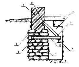 1 - усиливаемый фундамент; 2 - железобетонная обойма; 3 - отверстия в швах между блоками для установки рабочей арматуры; 4 - основная рабочая арматура усиления; 5 - отметка пола подвала; 6 - сколотая поверхность бетона; 7 - выпуски арматуры в подушке; 8 - сварка; 9 - зоны уплотненного грунта. Рис. 16. УСТРОЙСТВО ЖЕЛЕЗОБЕТОННЫХ ПРИЛИВОВ