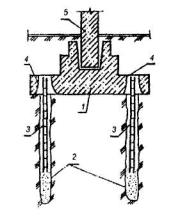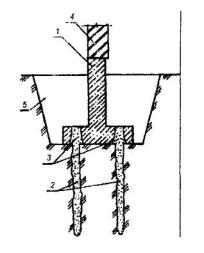 1 - усиливаемый ленточный фундамент; 2 - буроинъекционные (корневидные) сваи, устраиваемые через плитную часть усиливаемого фундамента; 3 - конусные отверстия в плитной части фундамента; 4 - кирпичная стена; 5 - пазух, заполняемый фунтом после устройства стыка свай с плитной частью фундамента. Рис. 23. ПЕРЕДАЧА НАГРУЗКИ ОТ ФУНДАМЕНТА НА БУРОНАБИВНЫЕ СВАИ