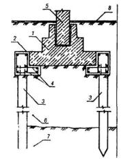 1 - усиливаемый фундамент; 2 - продольные металлические балки, устанавливаемые в пробитые борозды (штрабы); 3 - поперечные металлические балки; 4 - цементно-песчаный раствор; 5 - набивные сваи; 6 - железобетонная обвязка по сваям; 7 - кирпичная стена. Рис. 26. ПЕРЕДАЧА НАГРУЗКИ ОТ ФУНДАМЕНТА НА ЖЕЛЕЗОБЕТОННЫЕ СВАИ, ПОГРУЖАЕМЫЕ ВДАВЛИВАНИЕМ 1 - усиливаемый фундамент; 2 - железобетонная обойма, устраиваемая по периметру фундамента; 3 - сваи, погружаемые вдавливанием с поверхности основания; 4 - арматура усиления; 5 - колонна; 6-7 - соответственно слабый и прочный грунт; 8 - поверхность пола. Рис. 27. ВДАВЛИВАНИЕ СОСТАВНЫХ СВАЙ ЧЕРЕЗ ОТВЕРСТИЯ В ЖЕЛЕЗОБЕТОННОЙ ПЛИТЕ 1 - усиливаемый ленточный фундамент; 2 - монолитная железобетонная плита; 3 - отверстие в плите, устраиваемое при ее бетонировании; 4 - звенья составной железобетонной сваи; 5 - длинношточный гидравлический домкрат; 6 - металлический упор; 7 - анкерные болты; 8 - кирпичная стена. Рис. 28, ПЕРЕДАЧА НАГРУЗКИ ОТ ФУНДАМЕНТА НА СОСТАВНЫЕ ЖЕЛЕЗОБЕТОННЫЕ СВАИ, ПОГРУЖАЕМЫЕ ВДАВЛИВАНИЕМ