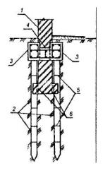 1 - усиливаемый фундамент; 2 - буронабивные сваи; 3 - железобетонная обойма; 4 - поверхность фундамента, подготовленная к бетонированию (насечка, сколы, зачистка); 5 - оголенная рабочая арматура существующего фундамента; 6 - арматура усиливаемого фундамента; 7 - железобетонная колонна. Рис. 24. УСТРОЙСТВО АНКЕРОВ ИЗ БУРОНАБИВНЫХ СВАЙ