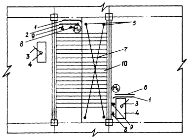 Монтажник М2 вставляет лом в зазор между верхней полуплощадкой и панелью перекрытия, а монтажник М1 - в зазор между нижней полуплощадкой и полуплощадкой ранее уложенного марша, после чего они рихтуют марш ломами. При помощи уровня монтажники проверяют горизонтальность полуплощадок марша, регулируя их высоту путем изменения толщины растворной постели