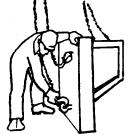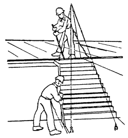 Монтажник М3 осматривает лестничный марш и счищает монтажные отверстия. Монтажник М2 вставляет стержни коромысловых захватов в монтажные отверстия одной полуплощадки лестничного марша и поворачивает коромысла параллельно маршу. Аналогично монтажники устанавливают два захвата на другой