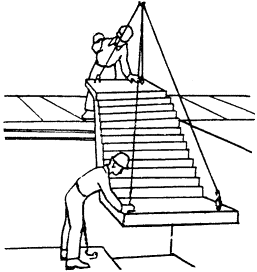 Монтажник М3 принимает строп, поданный машинистом крана, и, зацепив крюки стропа за кольца захватов, подает команду машинисту крана натянуть ветви стропа. Убедившись в надежности строповки, монтажник отходит на безопасное расстояние, а машинист крана по его сигналу поднимает и перемещает марш к месту установки. Монтажник М2 в это время направляется туда же