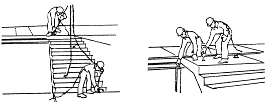 Монтажник М1 подает команду машинисту крана ослабить натяжение ветвей стропа и вместе с монтажником М2 расстроповывает марш, отцепляя крюки стропа от серег захватов. Монтажники М1 и М2 вынимают стержни захватов из монтажных отверстий лестничного марша. После этого оба монтажника навешивают захваты на крюки стропа, а машинист крана перемещает оснастку к месту строповки следующего марша