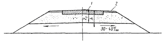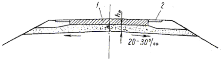 7,5 м. Предварительно вычисляем отношение Для этого отношения и поперечного уклона i = 0,02 находим по номограмме hнас = 0,08 м. Таким образом, h = hнас + hзап = 0,08 + 0,15 = 0,23 м. Достаточность этой толщины для временного размещения поступающей воды до начала работы дренирующих устройств проверяем по формулам (10) - (12). По формуле (11) Qрасч = 6 × 0,029 = 0,17 м3, где 6 - число суток до начала работы дренажных устройств, а по формуле (12) Qдоп = 7 × 0,36(0,08 + 0,11 - 0,23 × 0,42) = 0,23 м3. Так как Qдоп > Qрасч, размещение всего количества воды обеспечено. Второй