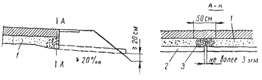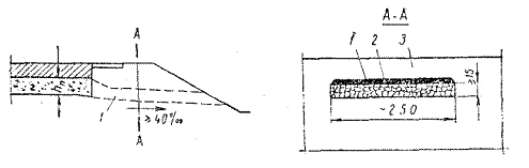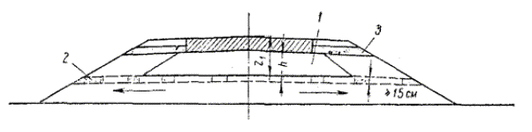 вычисляем отношение Необходимая полная толщина дренирующего слоя hп = hнас + hзап = 0,2 + 0,15 = 0,35 м. Таким образом, толщину песчаного слоя следует увеличить на 7 см. Проверяем по формулам (10) - (12), достаточна ли эта толщина песчаного слоя для временного размещения воды до начала дренирования. Определяем сначала общее количество воды Qpacч, поступающее за tзап = 6 суткам (п. 35): Qpacч = qtзап = 0,05 × 6 = 0,3 м3/пог. м. Затем по формуле (12) находим количество воды, которое может разместиться в порах дренирующего слоя: Qдоп = bn(hнас + hк.зап - hпjзим) = 7,5 × 0,34(0,2 + 0,11 - 0,35 × 0,46) = 0,38 м3, т.е. Qдоп > Qрасч. Это свидетельствует о достаточной толщине (35 см) песчаного слоя. Величина hк.зап = 0,11 принята по п. 35, а jзим = 0,46 - по табл. 6; пористость n = 0,34 вычислена при стандартной плотности песка, равной 1,75 г/см3. С учетом данных о стоимости сооружения насыпи из местных грунтов, а также стоимости на месте работ песков разной крупности производят технико-экономическое сравнение двух запроектированных вариантов. Пример 2. Дорога III категории с асфальтобетонным покрытием проектируется во II климатической зоне. Один из участков дороги проходит по пересеченной местности с глубоким залеганием грунтовых вод; поверхностный сток обеспечен. По характеру увлажнения местности участок относится к типу I. Продольный уклон на основном протяжении равен 0,05, в конце участка смягчается до 0,01 вставкой вертикальной кривой. Земляное полотно сооружено из тяжелого пылевого суглинка wтек = 0,3. В районе строительства имеется песок средней крупности с коэффициентом фильтрации 4 м/сутки. Оптимальная плотность песка - 1,7 г/см3 (пористость n = 0,36). Так как проектируемый участок дороги находится в условиях I типа увлажнения местности, то расчет конструкции на морозоустойчивость не производится. На основании исходных данных по формулам (6) - (8) находим ожидаемое поступление воды в дренирующий слой весной: q = 0,009 + 0,004 + 0,016 = 0,029 м3/сутки на 1 пог. м. Для своевременного отвода этого количества воды возможны два варианта дренирующих устройств: сплошной песчаный, слой на всю ширину земляного полотна (см. рис. 9) и песчаный слой на ширину проезжей части с продольными трубчатыми дренами по краям (см. рис. 8). Сначала определяем необходимую толщину дренирующего слоя на участке с однообразным уклоном. Первый