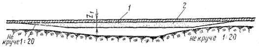 При этих значениях и lпуч.д = 2 см находим по номограмме z1/H = 0,56, откуда z1 = 0,56 × H = 0,56 × 230 ≈ 130 см, т.е. соответствует предварительно принятой. В эту толщину стабильного слоя входят цементно-бетонное покрытие (22 см) и основание из мелкого песка, укрепленного цементом (20 см). Второй вариант. Земляное полотно сооружается из местного тяжелого пылеватого суглинка. Задаемся возвышением покрытия над поверхностью земли - 180 см. При этом: