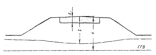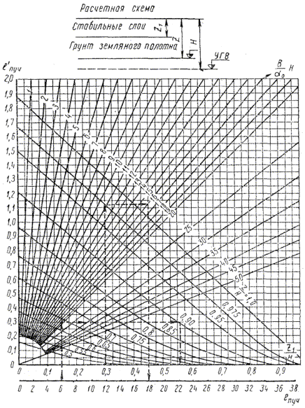 Для lпуч.д = 2 см по номограмме получаем z1/H = 0,25. Необходимая толщина стабильного слоя z1 = 0,25 × 280 = = 70 см. В состав стабильного слоя в данном случае входит цементно-бетонное покрытие (22 см), основание из песка, укрепленного цементом (20 см), и слой песка средней крупности толщиной 28 см. Техническая характеристика рассмотренных вариантов