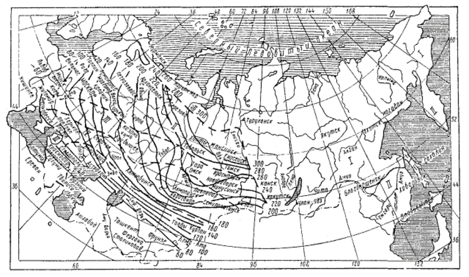 соответствуют различным отношениям 22. При втором типе местности по условиям увлажнения во II и III климатических зонах толщина морозозащитного слоя назначается по табл. 2. При этом должно быть обеспечено возвышение низа стабильного слоя над поверхностью земли, требуемое по табл. 16 СНиП II-Д.5-62 (п. 4.7). Во всех случаях возвышение покрытия над поверхностью земли не должно быть меньше, чем это требуется по условиям незаносимости снегом. Толщины в табл. 2 даны для материалов морозозащитных слоев с коэффициентом пучения, не превышающим 1 % (приложение 1). На дорогах с асфальтобетонными (а также с облегченными усовершенствованными) покрытиями могут использоваться материалы с более высоким коэффициентом пучения (но не более 3 %). В этих случаях к толщинам, приведенным в таблице, следует добавлять 10 см на каждый процент коэффициента пучения сверх 1 % . Рис. 13. Карта изолиний глубины промерзания по Л.Т. Абрамову: