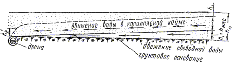 Примечания. 1. Значения расчетной влажности указаны для западных районов; для районов восточнее р. Северная Двина и Волга, где климат более континентальный, приводимые значения относительной влажности могут быть снижены на 5 - 10 %. 2. Данные о расчетных влажностях грунта земляного полотна получены при толщине одежды в среднем около 0,5 м. В случаях, когда одежда (стабильный слой) имеет большую толщину, влагонакопление в верхней части земляного полотна, вследствие большей пригрузки, происходит менее интенсивно. В этих случаях расчетную влажность грунта земляного полотна следует устанавливать, пользуясь номограммой рис. 16. Рис. 16. Номограмма для определения расчетной влажности грунта 32. Количество воды, поступающей в основание с поверхности дороги, q3 определяется в зависимости от интенсивности осадков в расчетный период с учетом стока и испарения. Для дорог с капитальными покрытиями в расчет принимают наибольшее месячное количество осадков в период оттаивания дорожной конструкции (или в период максимального выпадения осадков в южных районах), наблюдающееся за 20 лет, а для дорог с покрытиями других типов - за 10 лет. Суточный объем воды, проникающей с поверхности в основание проезжей части на 1 пог. м дороги, вычисляют по формуле: где S - месячное количество осадков, выпадающих за расчетный период, мм; С - коэффициент, учитывающий сток с поверхности дороги, смачивание и испарение. Остальные обозначения приведены ранее. Если расчет ведется при незамерзшем земляном полотне, в формулу вводится только ширина проезжей части - b. В формуле (8) сумма осадков принята в мм за расчетный период 30 дней и учтен коэффициент неравномерности выпадения осадков 1,5, в связи с этим при пересчете объема воды в м3 на 1 пог. м знаменатель равен 20000. Сведения о количестве осадков имеются в климатологических справочниках Гидрометиздата СССР. Их можно также получить в местных метеорологических станциях. Для основных пунктов Европейской части СССР данные о расчетном количестве осадков приведены в приложении 2. Коэффициент С, по данным Н.А. Пузакова, можно принимать равным 0,6 - 0,7 при суглинистых грунтах обочин и 0,4 - 0,5 - при супесчаных. Если обочины достаточно водонепроницаемы, коэффициент С может быть повышен до 0,8 - 0,9. 33. Последние исследования показали, что при гидравлическом расчете дренирующих слоев в основании проезжей части вследствие сравнительно небольшой мощности свободного потока нужно учитывать движение воды не только в зоне полного насыщения дренирующего материала, но также и в капиллярной кайме. Установлено, что при малой толщине водонасыщенного слоя расход воды, движущейся в капиллярной кайме, соизмерим с расходом свободной воды, а иногда и превосходит его. Опыты показали, что движение воды в дренирующем слое происходит в виде двух взаимосвязанных потоков, расположенных в два яруса (рис. 17); в нижнем потоке движется свободная, а в верхнем - капиллярная вода. Поскольку в каждом из потоков имеет место ламинарный режим движения воды, для вывода расчетных формул, определяющих ее расход, возможно применение закона Дарси. Единичный расход воды вычисляется по двухчленной формуле, первый член которой дает расход свободной воды, а второй - расход воды, перемещающейся в капиллярной кайме:
