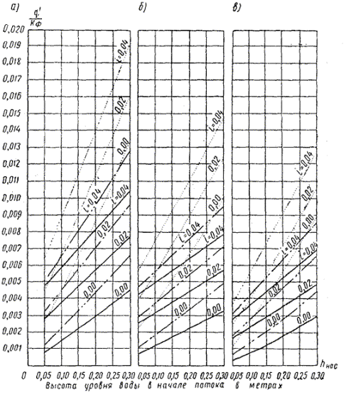 Вертикальная ось Рис. 18. Номограммы для расчета дренирующего слоя: а - для мелких песков; б - для песков средней крупности; в - для крупных песков; i - поперечный уклон грунтового основания; При ширине проезжей части 7 - 7,5 м с двухскатным поперечным профилем, когда вода из дренирующего слоя отводится продольными трубчатыми дренами (см. рис. 8), а также поперечными трубчатыми или щебеночными дренами (см. рис. 7 и 11), длина пути фильтрации до приемной части дрен составляет 3,5 - 3,75 м. При двухскатном поперечном профиле фильтрация воды происходит в обе стороны от оси дороги. В этом случае принимается q1 = 0,5q. При проезжей части шириной 7 - 7,5 м с односкатным профилем, а также на дорогах с четырехполосной проезжей частью при двухскатном профиле, когда проектируются дрены указанных типов, расчет ведут при L = 7,5 м и q1 = q. При этой же длине пути фильтрации и q1 = 0,5q рассчитывают и дренажную систему со сплошным дренирующим слоем под обочинами (см. рис. 9) на дорогах с двухскатной проезжей частью шириной 7 - 7,5 м. На дорогах с четырехполосной проезжей частью при устройстве сплошного дренирующего слоя под обочинами можно принимать L = 10,5 м и q1 = q. При длине пути фильтрации, значительно отличающейся от указанных, следует пользоваться формулой (9). При